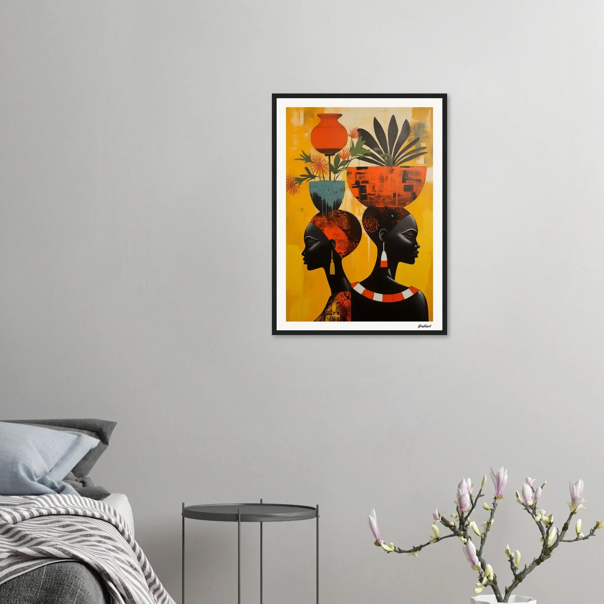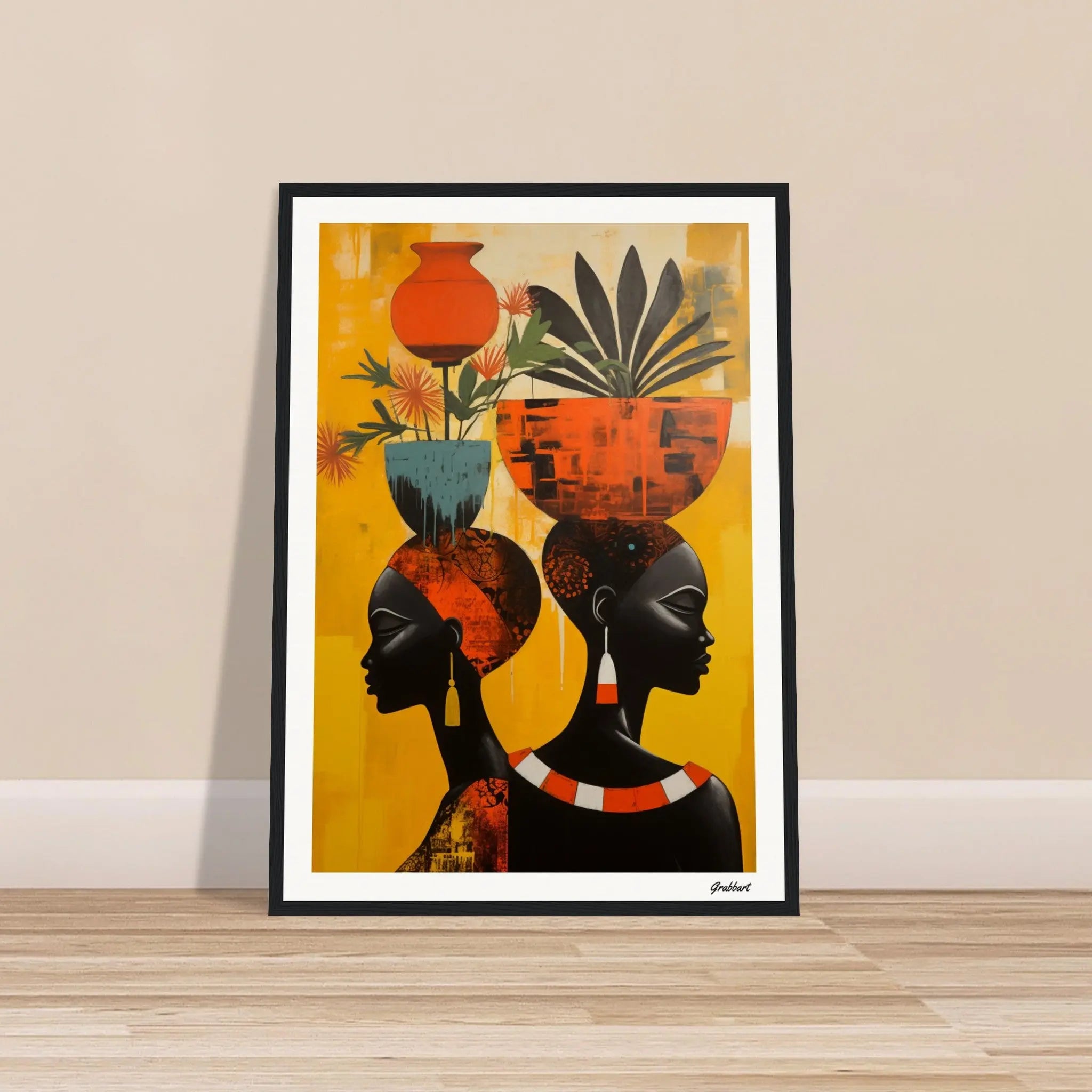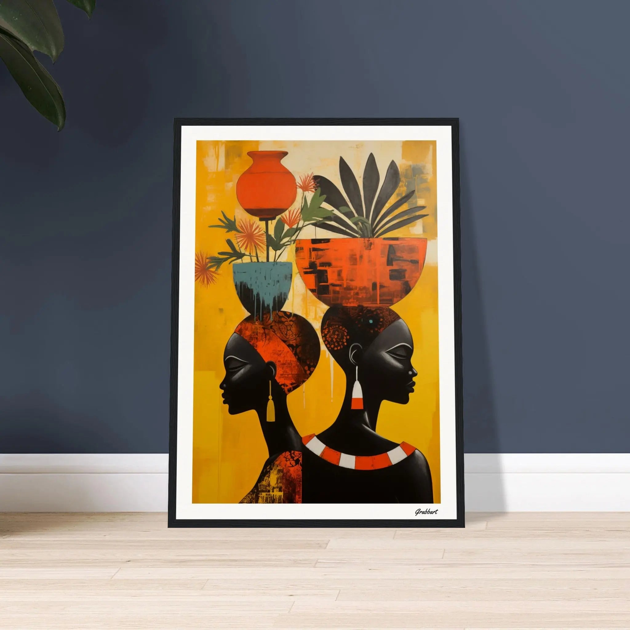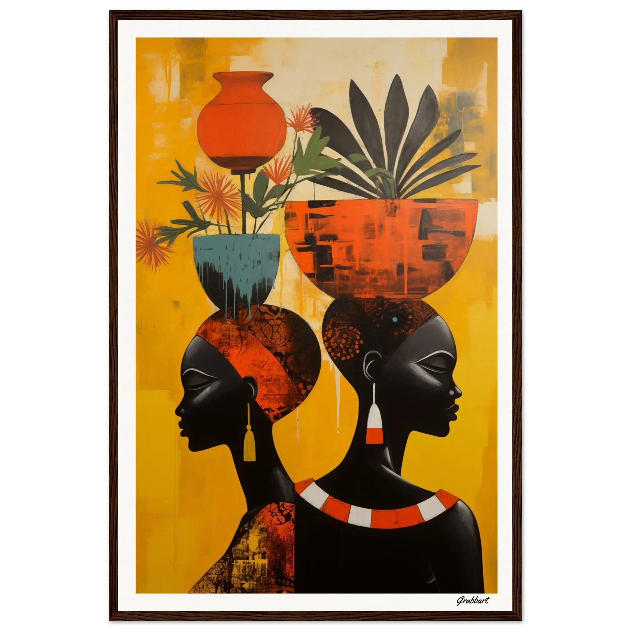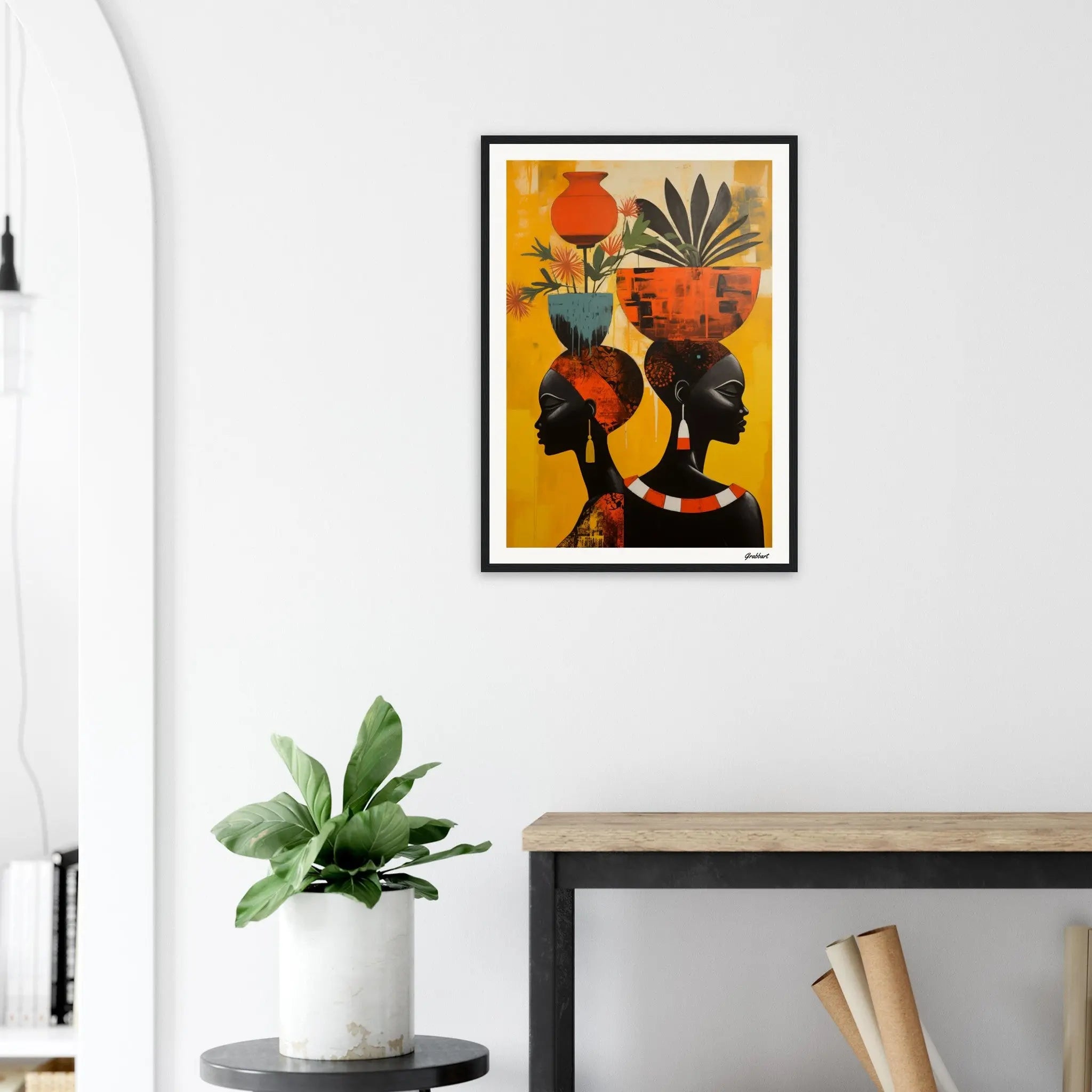 Elevate your space with a transcendent art experience. "Eclat d'Ébène: A Symphony of Grace and Botany" is a stunning masterpiece that unites the ethereal touch of Impressionism with the vivid hues and cultural richness of African aesthetics. Set against a radiant yellow backdrop, two African ladies embody grace and resilience as they balance potted plants atop their heads—capturing the spirit of harmony between humanity and nature.