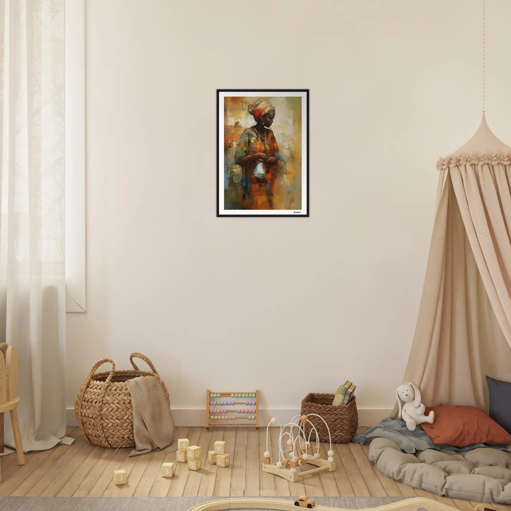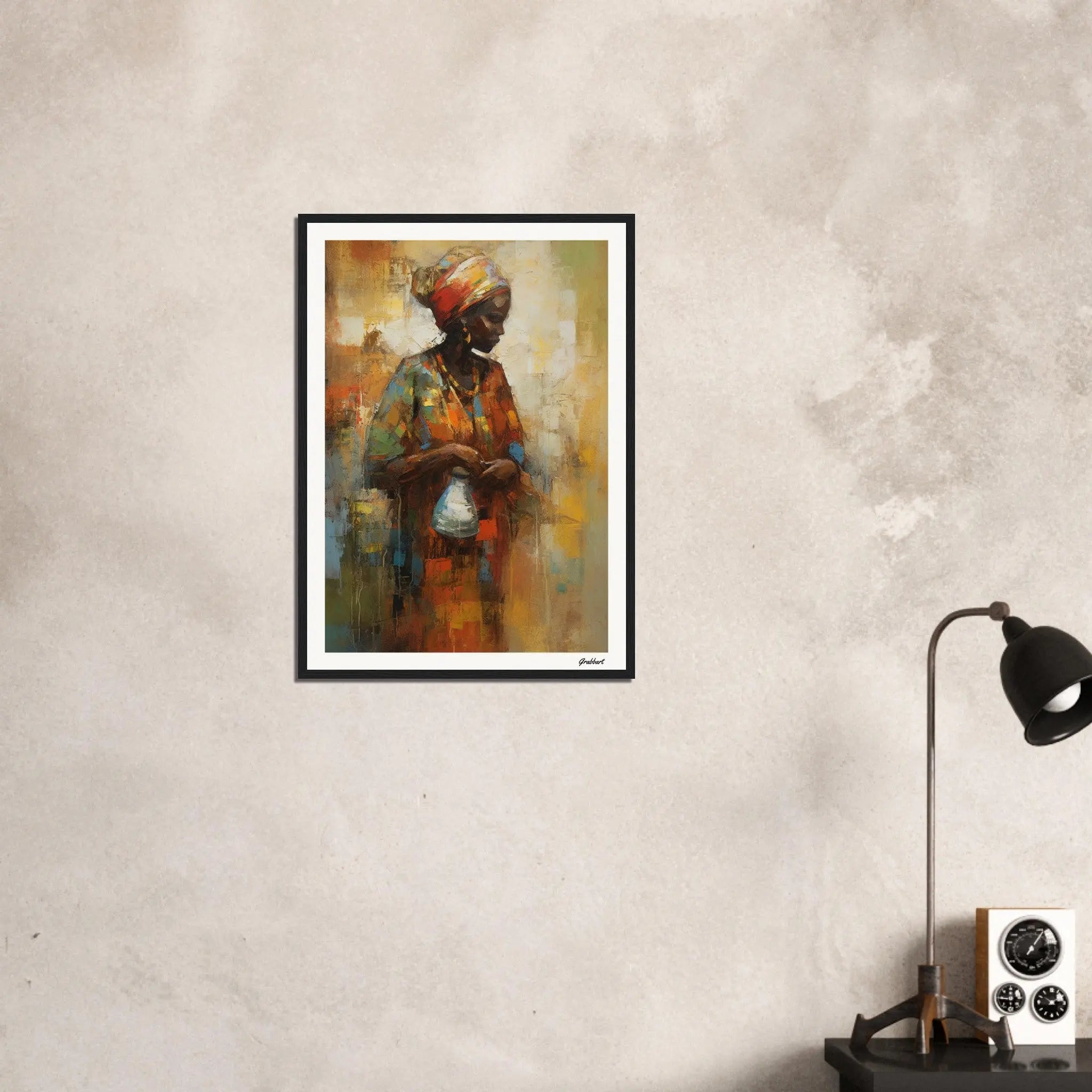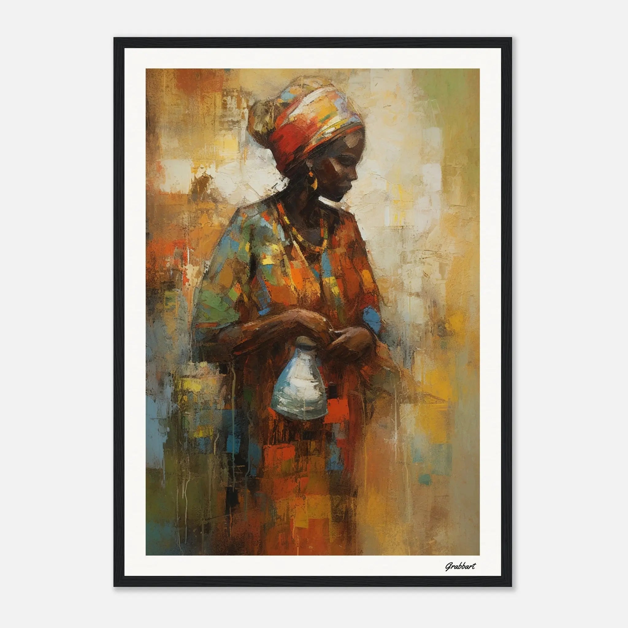 Unveil the pinnacle of visual storytelling with "The Alchemy of Radiance: A Soliloquy in Color," a masterful amalgamation of Impressionist technique and vivid African flair. In this captivating art piece, a solitary African woman holds a vase—her eyes a wellspring of untold stories. The woman is adorned in an explosion of colors, wearing a kaleidoscopic headdress that seems to imbue her with an otherworldly grace.