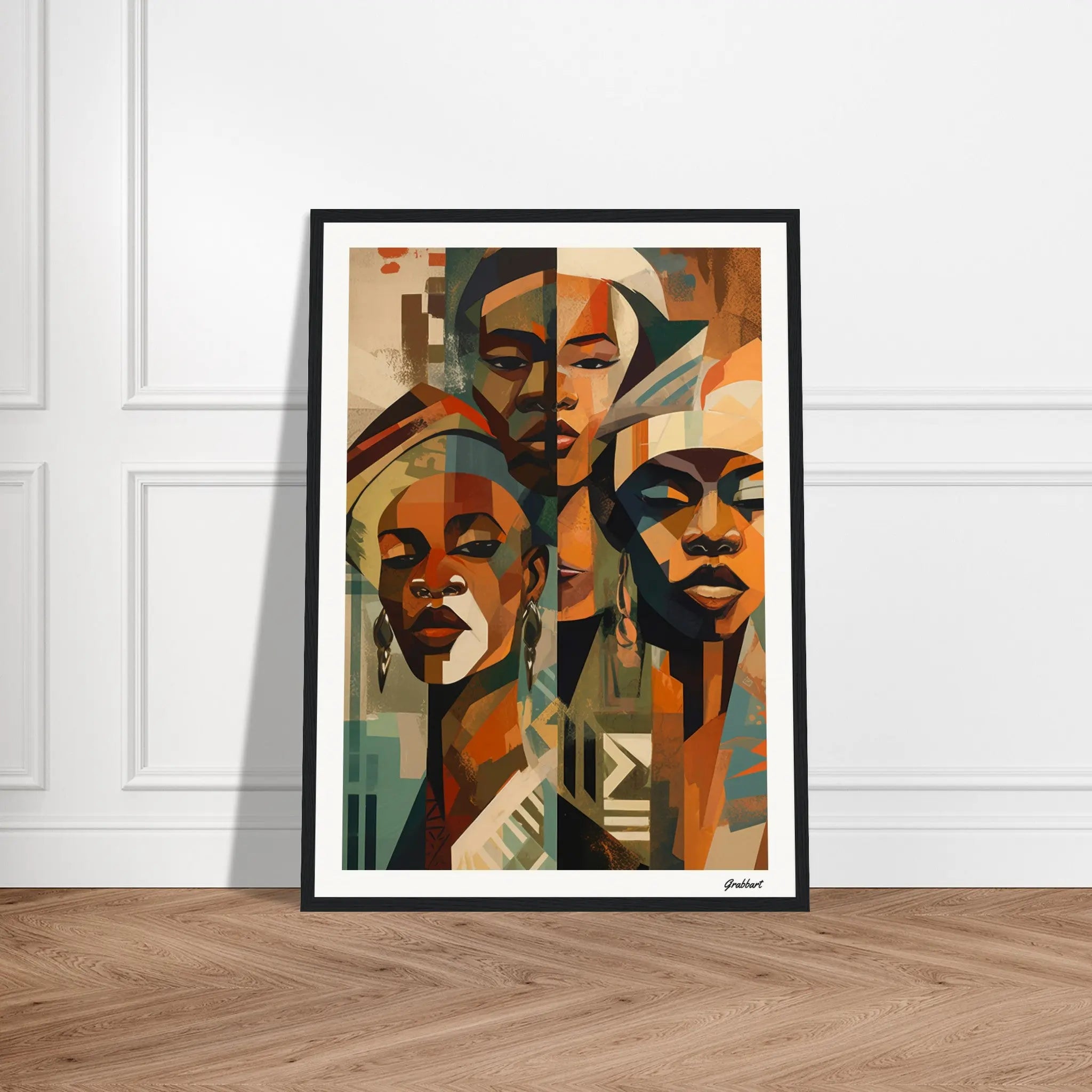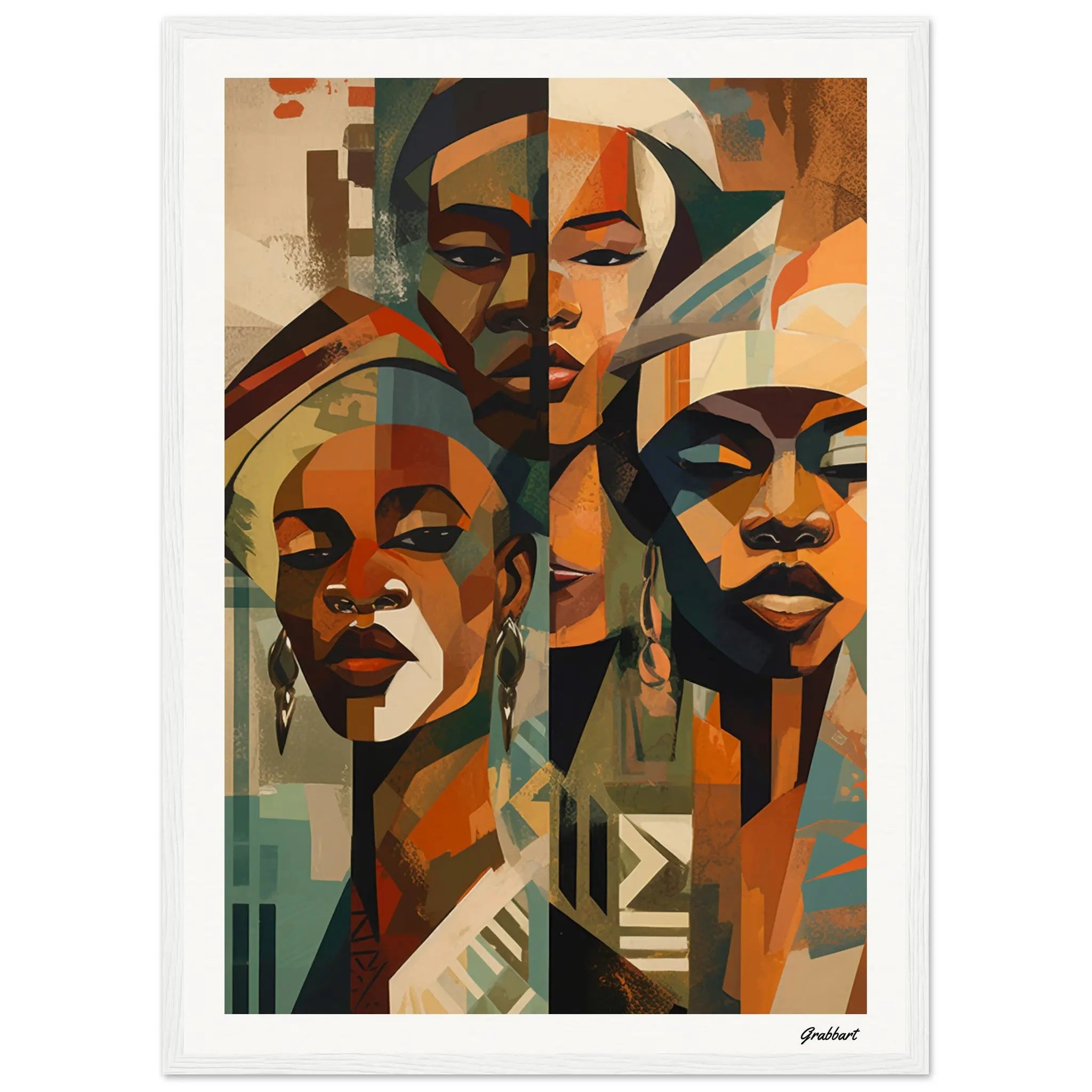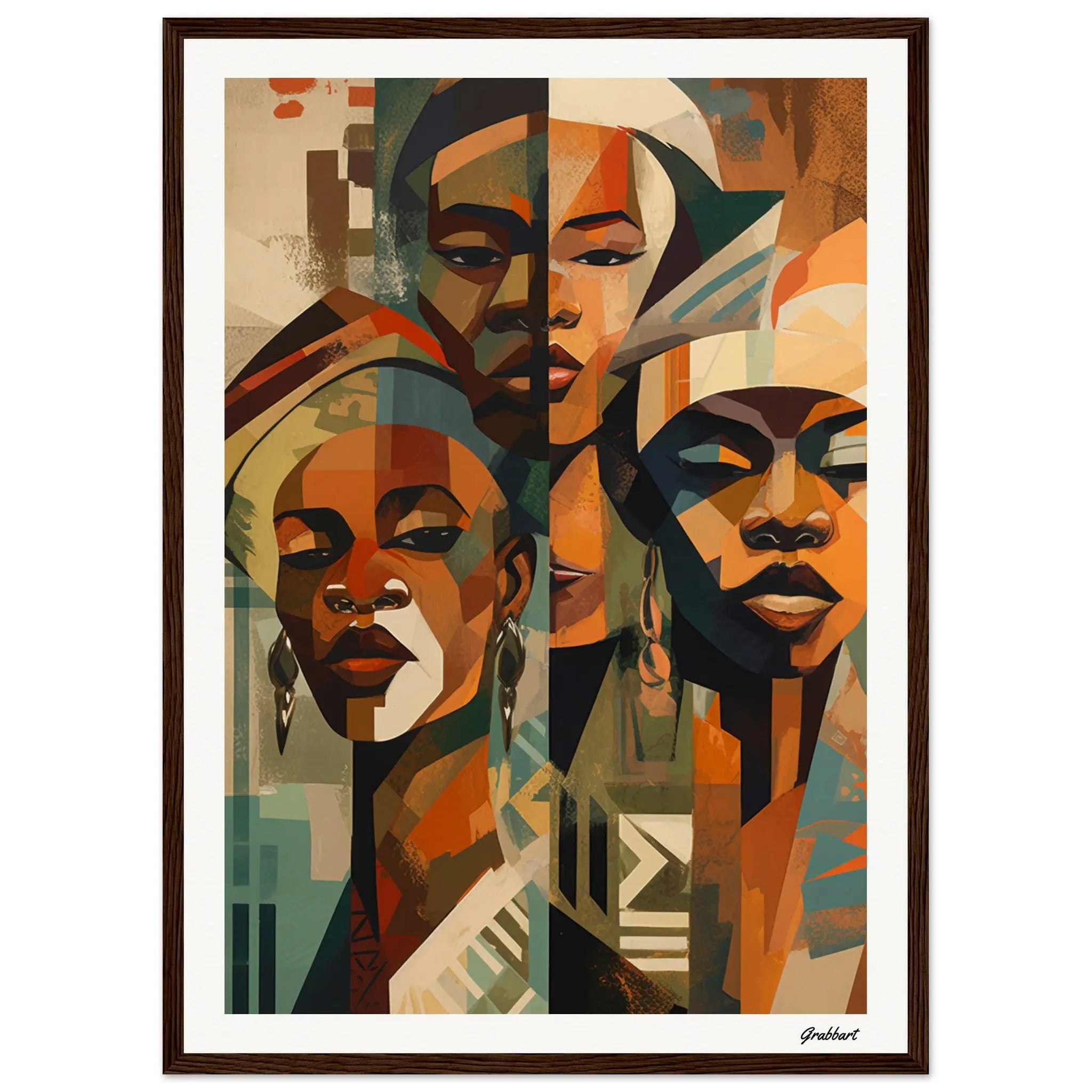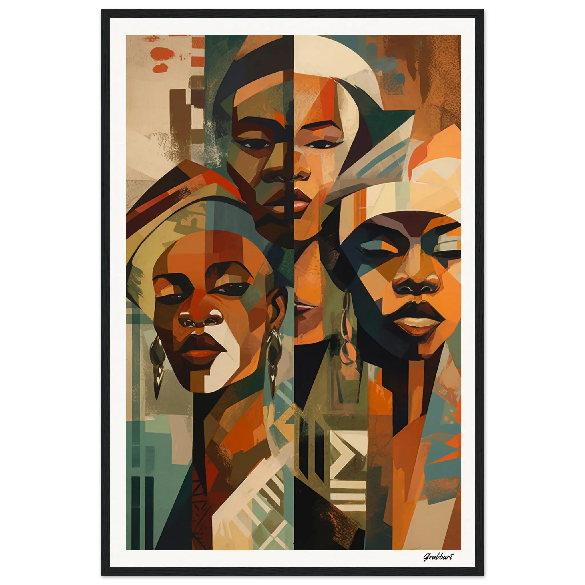 Experience the majesty of "The Triumvirate: A Gaze of Beninese Royalty," an Impressionist portrait that captures the commanding presence of three African queens. Drawing inspiration from the artistic traditions of Benin, this compelling work focuses solely on the faces of these strong women, each adorned in intricately designed headdresses. The central colors—rich browns, forest greens, and calming beiges—lend an earthy, grounded feeling to the piece, amplifying its gravitas.