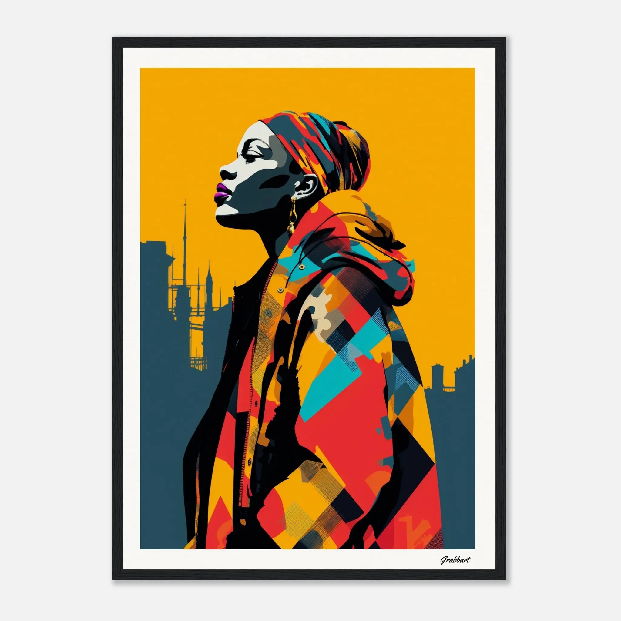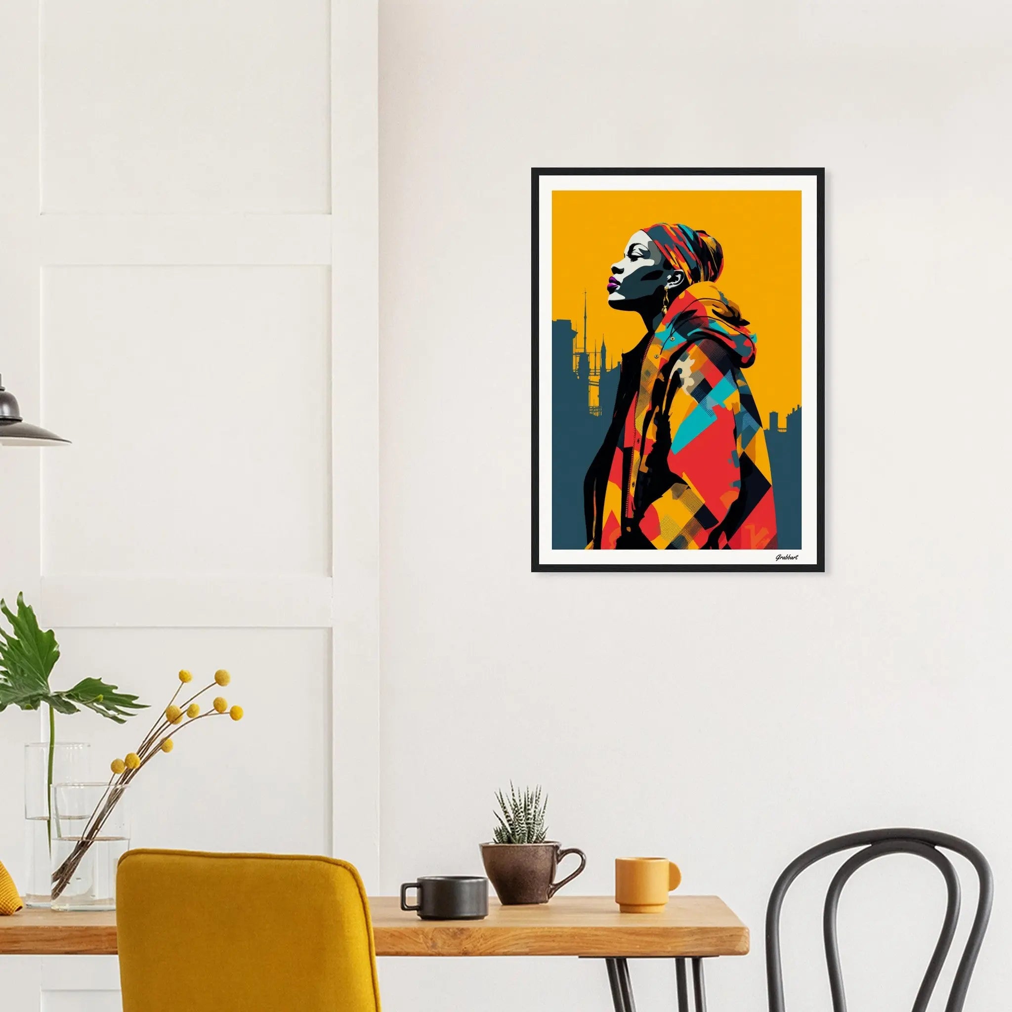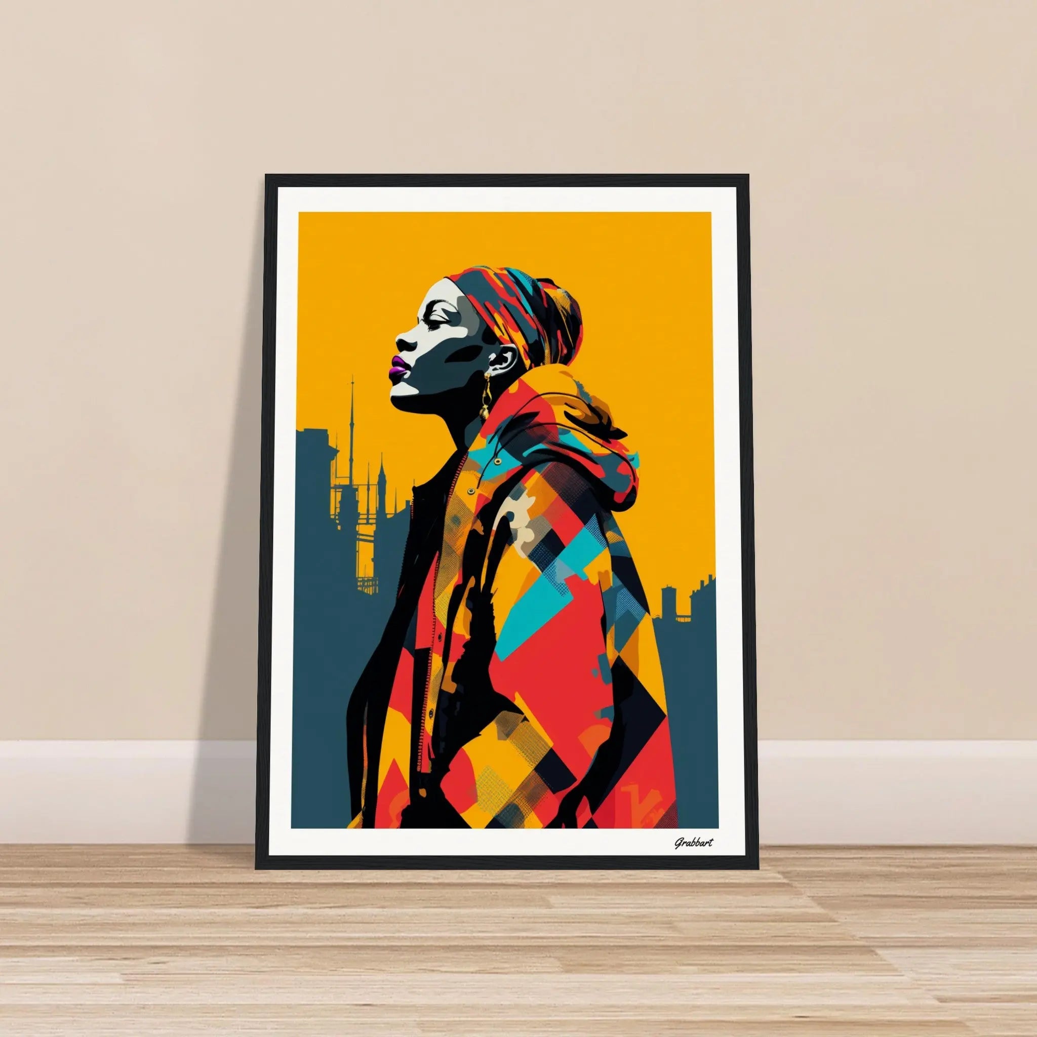 The print captures a modern young woman looking up and to the left, standing against the stark contrast of a destroyed cityscape. Her gaze seems to seek something beyond the frame, possibly hope or a new beginning. The background, awash in varying shades of orange, not only sets the stage for the dramatic scene but also reflects the sense of urgency and transformation embedded in the image.