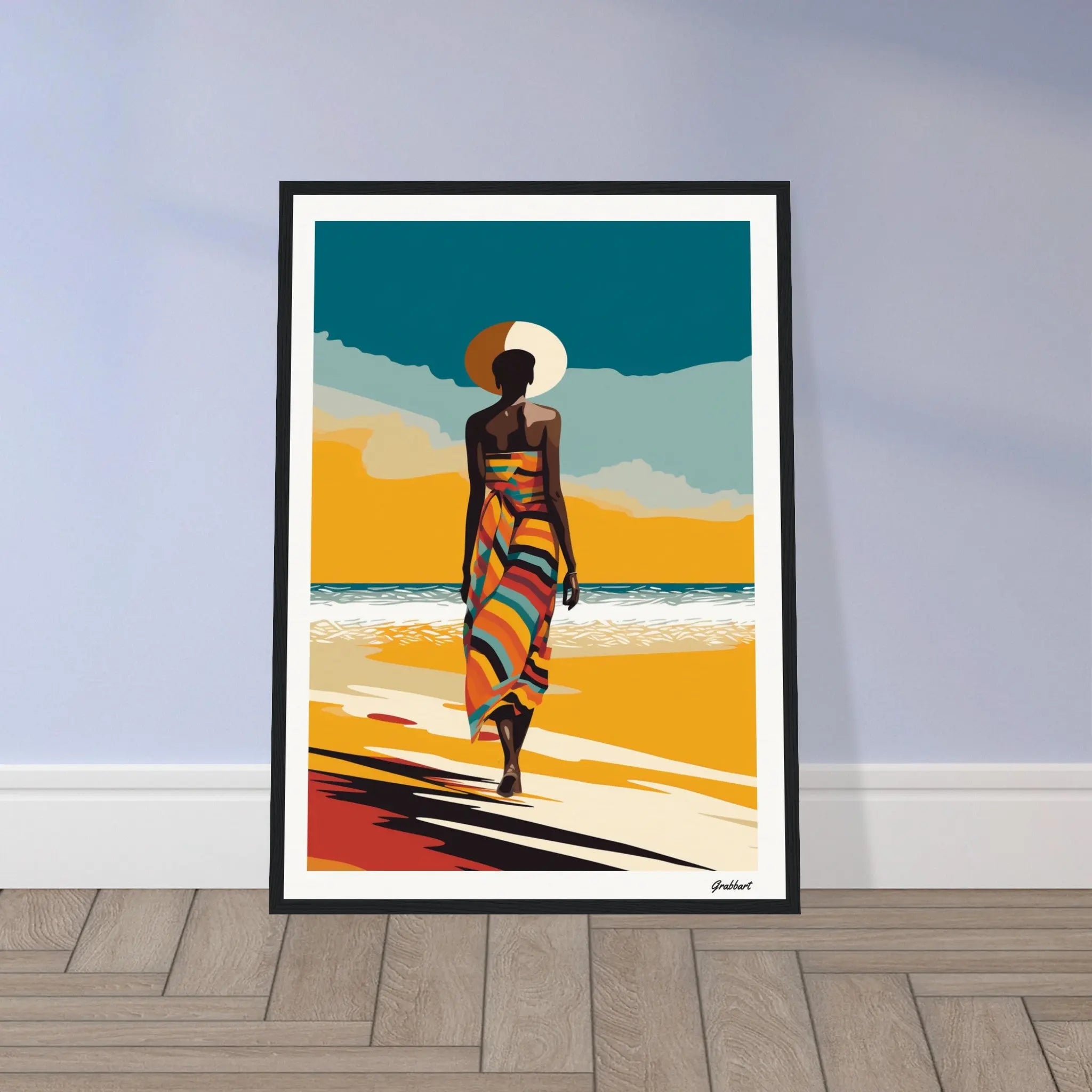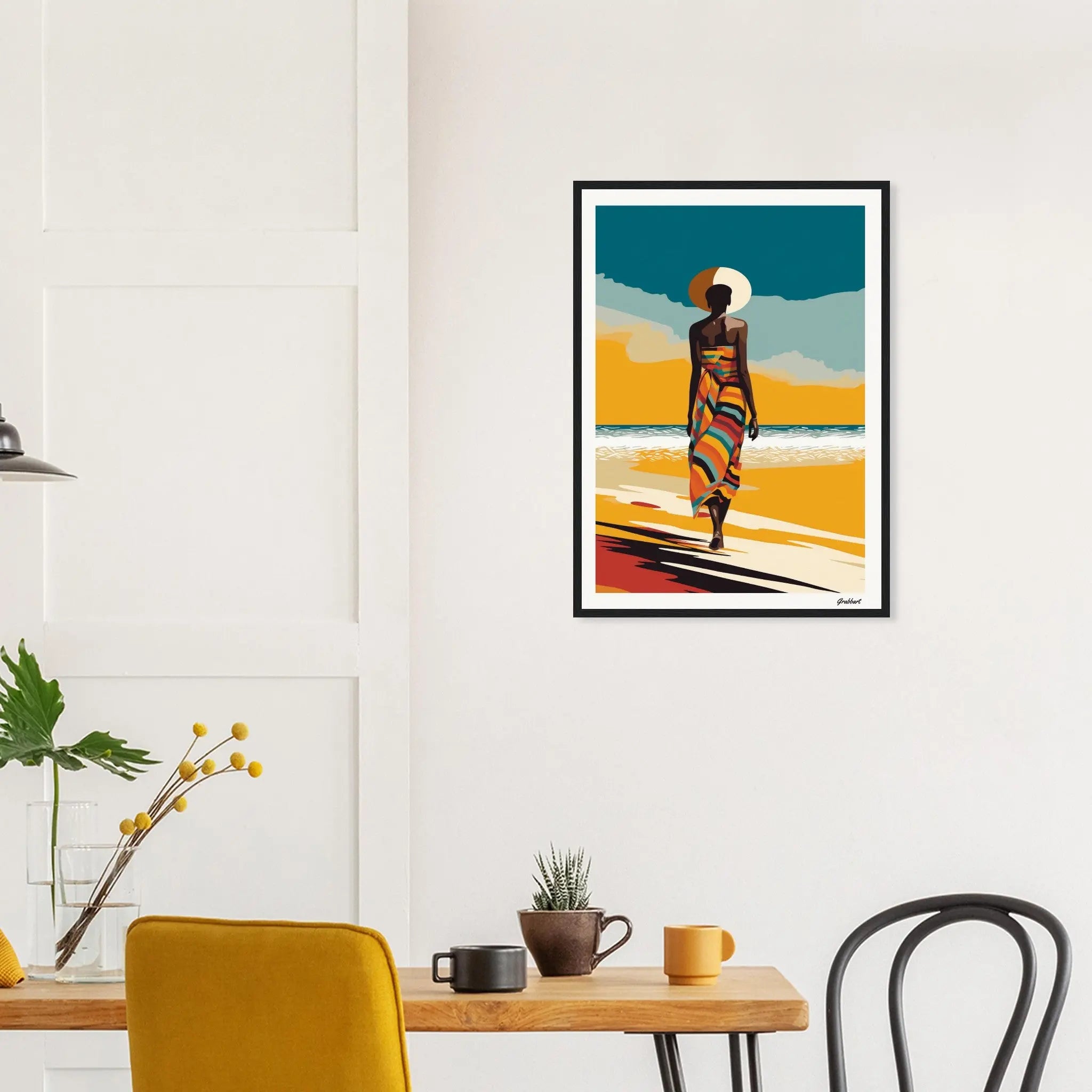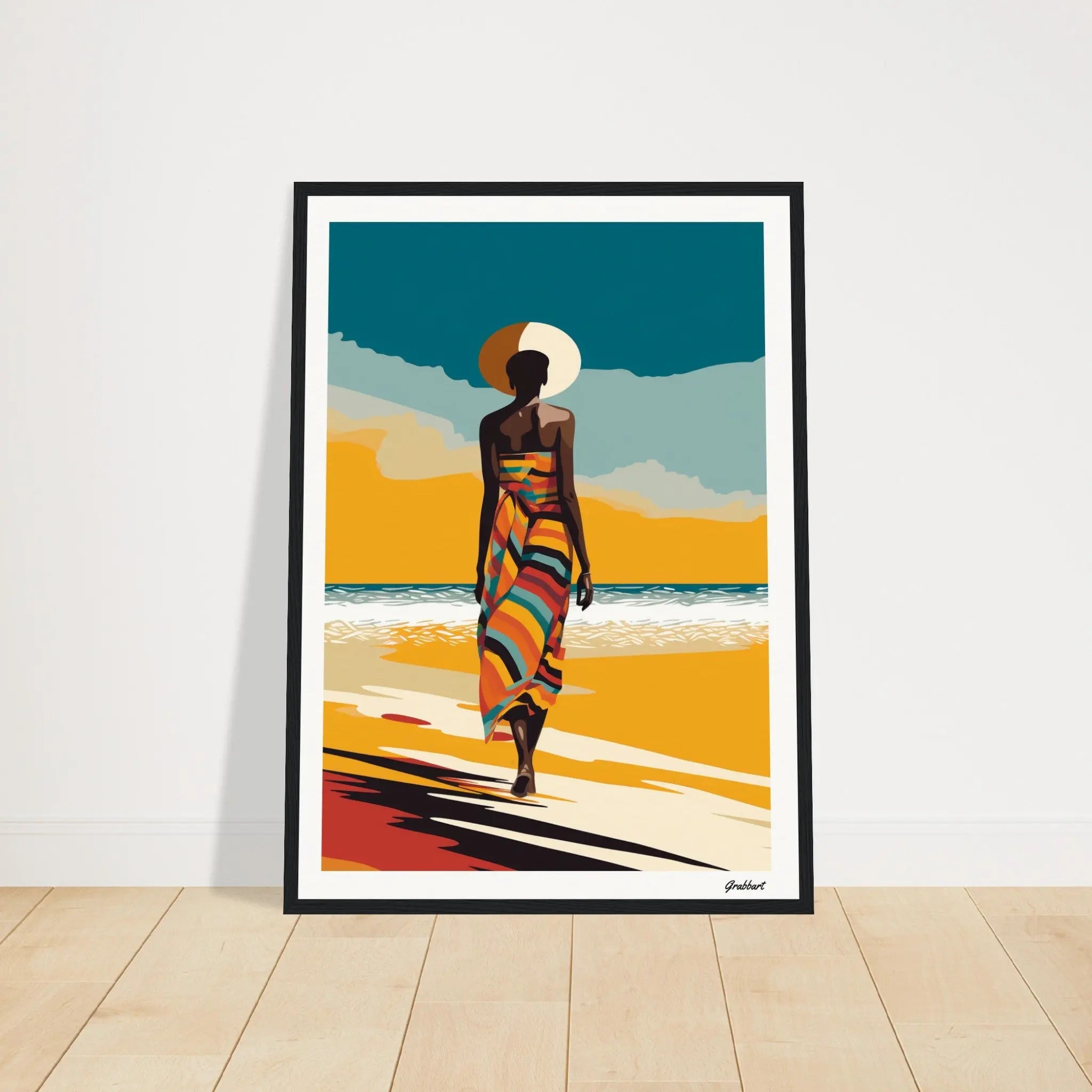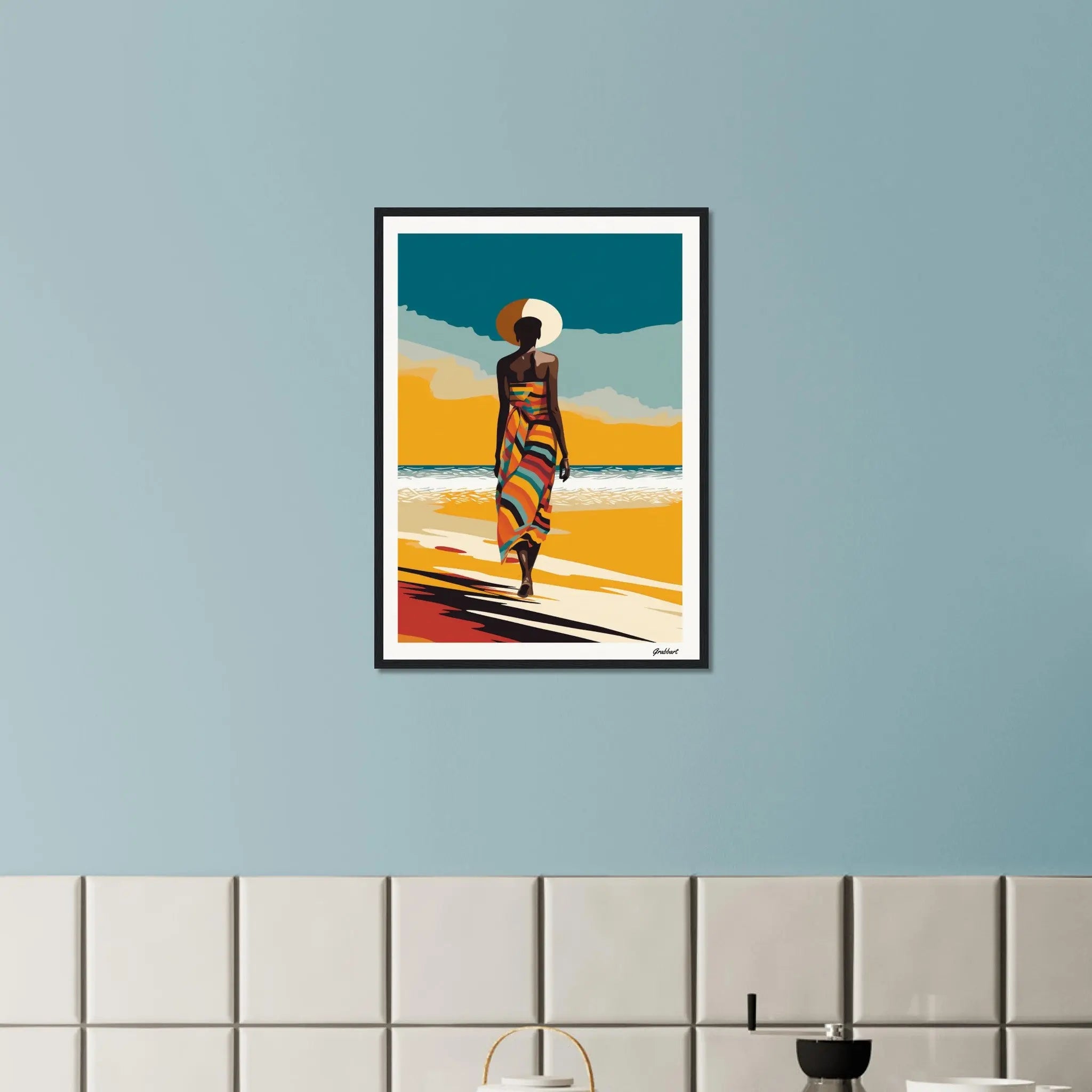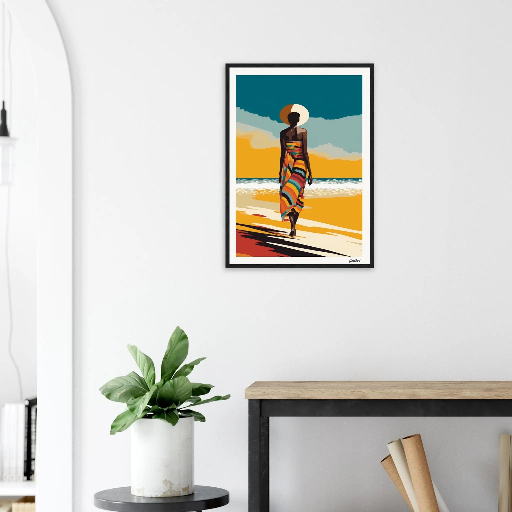This evocative artwork captures the back view of a woman walking towards the water, her silhouette set against a setting sun. The way her beach hat and the ocean merge into the hues of the horizon speaks to a serene moment of solitude and reflection, inviting the viewer into a world of peaceful retreat.