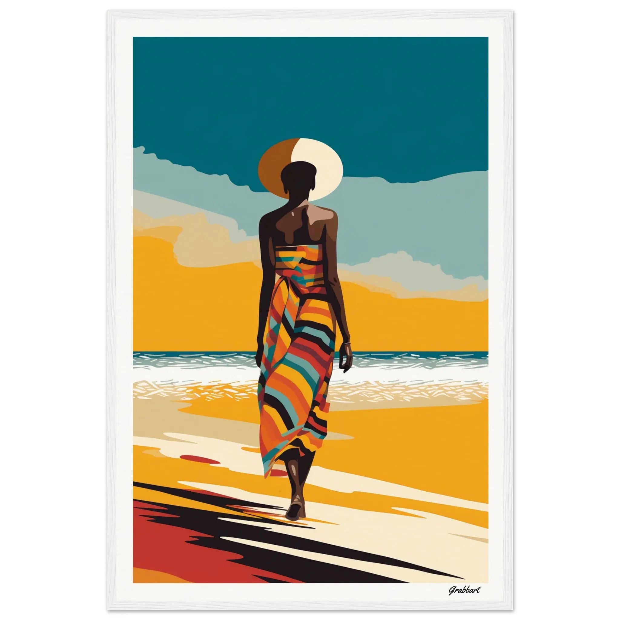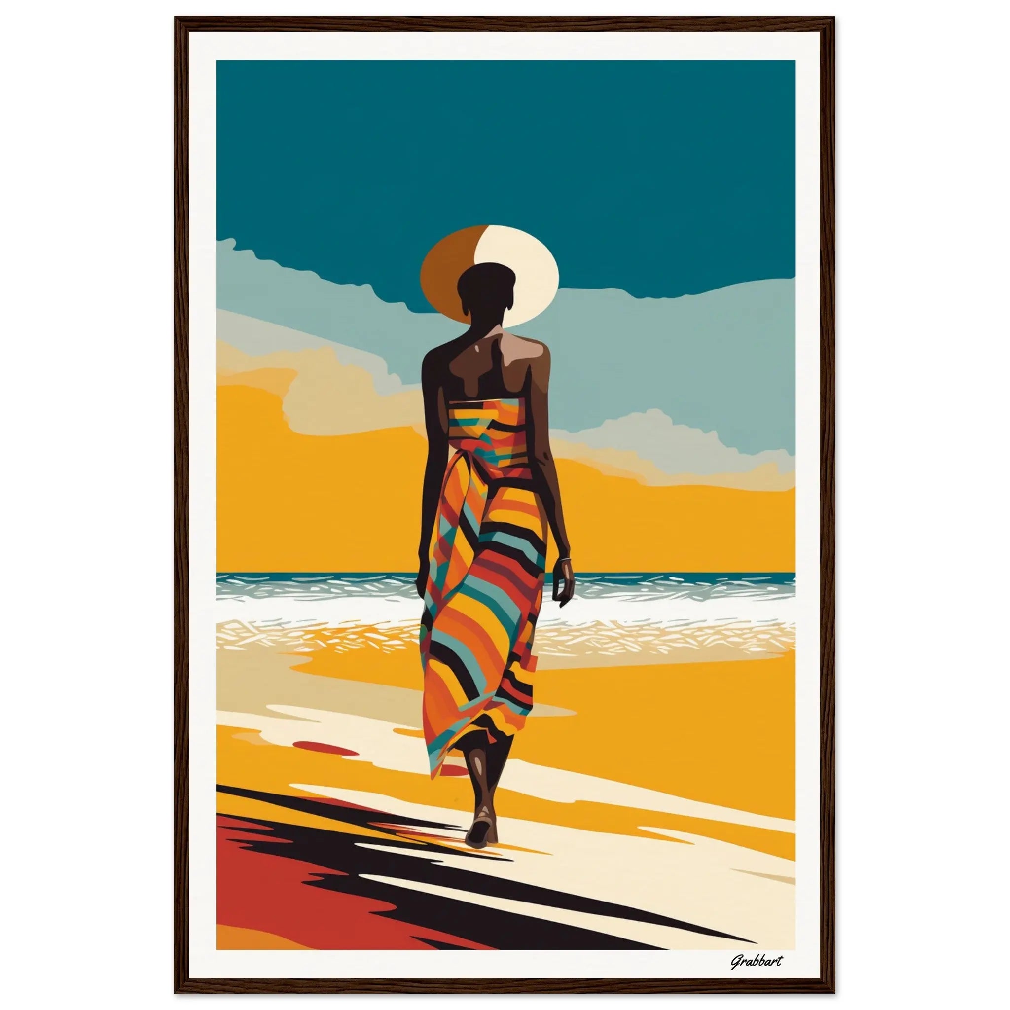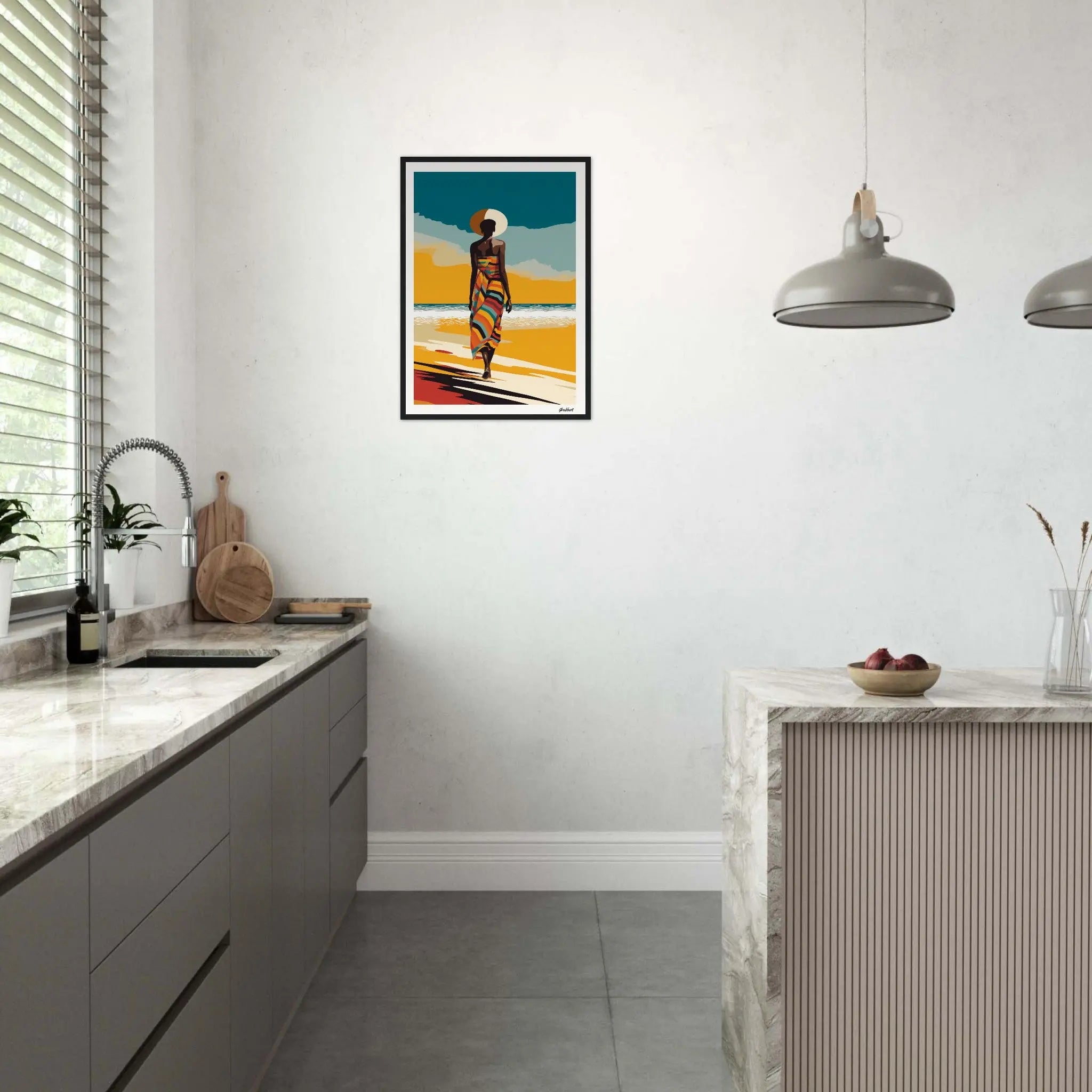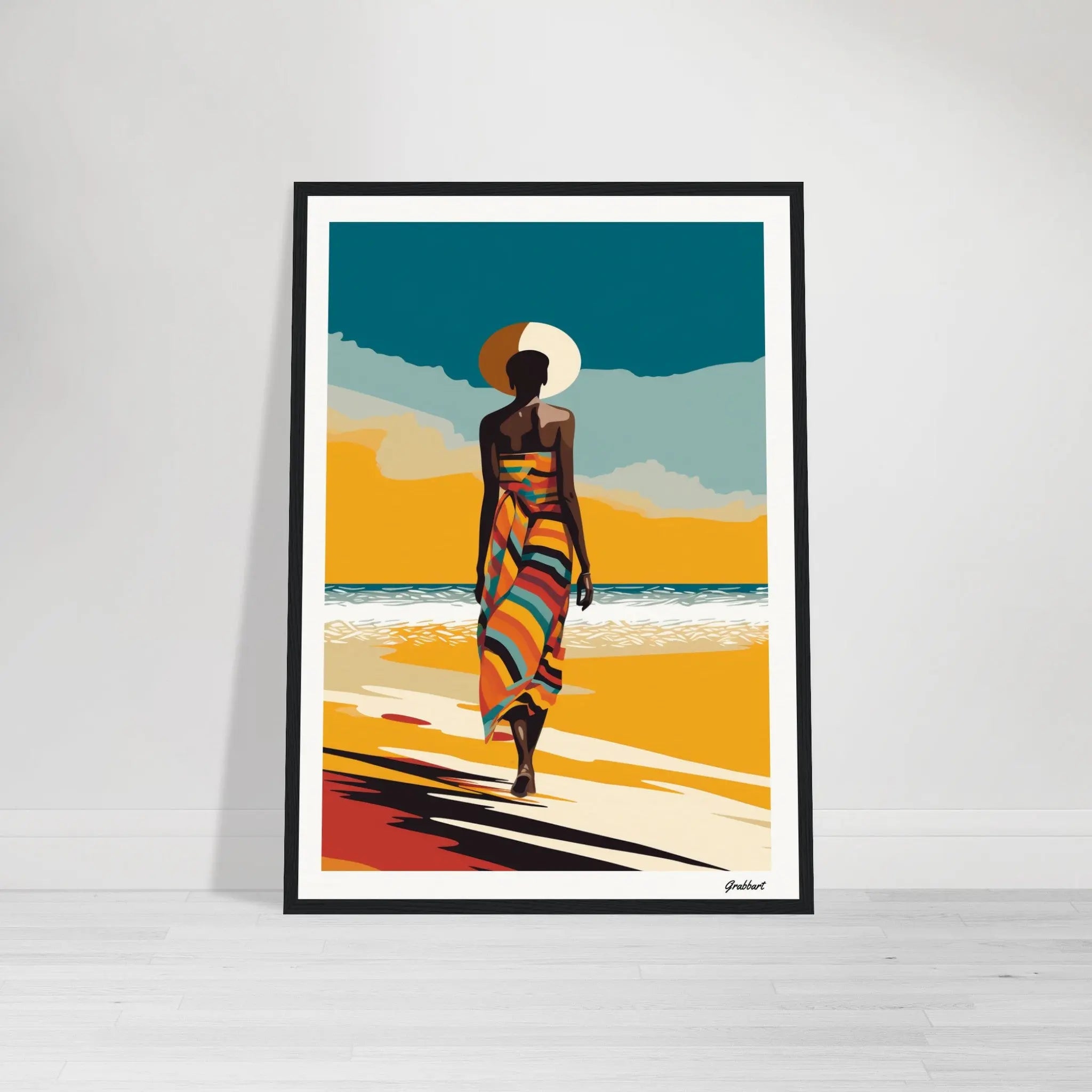 This evocative artwork captures the back view of a woman walking towards the water, her silhouette set against a setting sun. The way her beach hat and the ocean merge into the hues of the horizon speaks to a serene moment of solitude and reflection, inviting the viewer into a world of peaceful retreat.