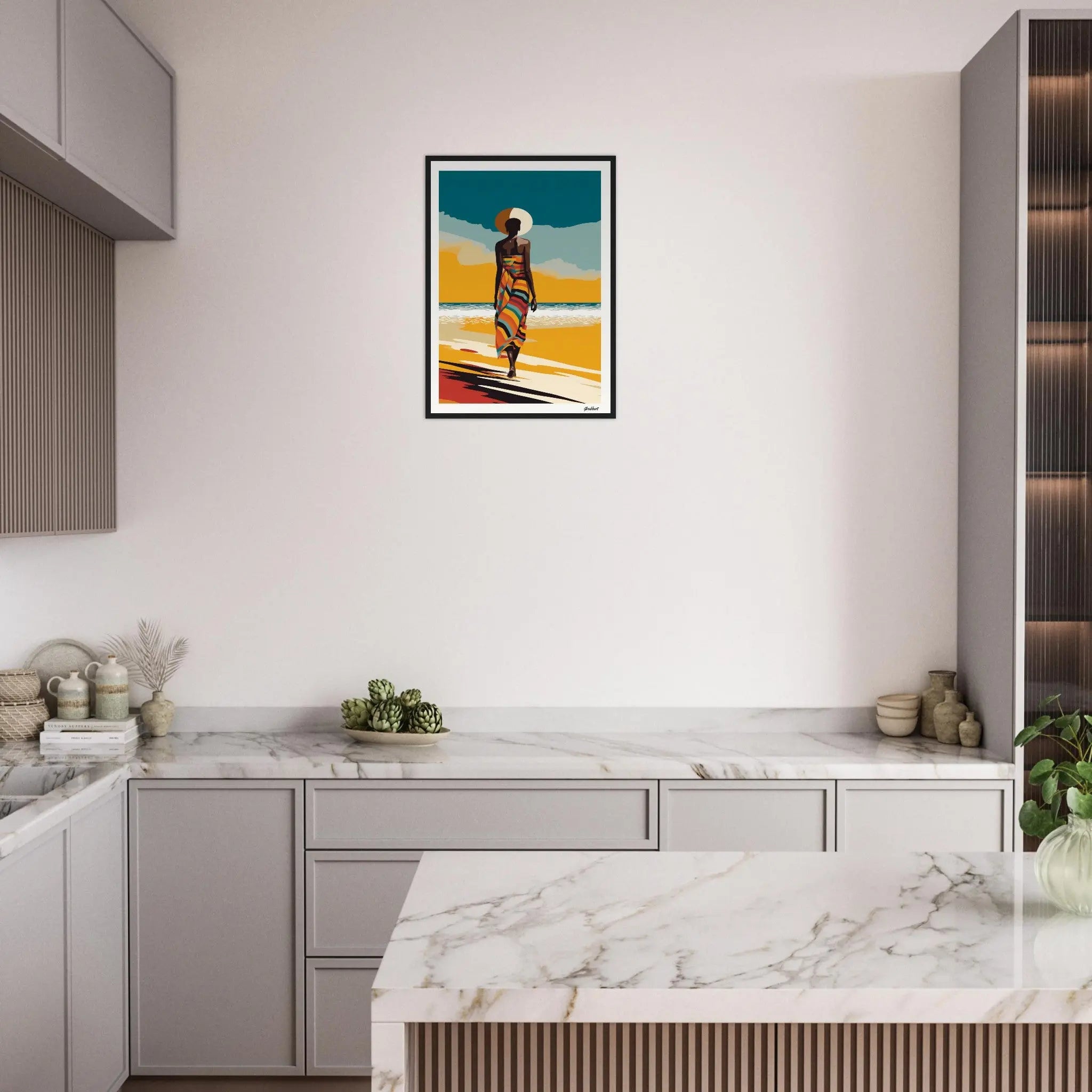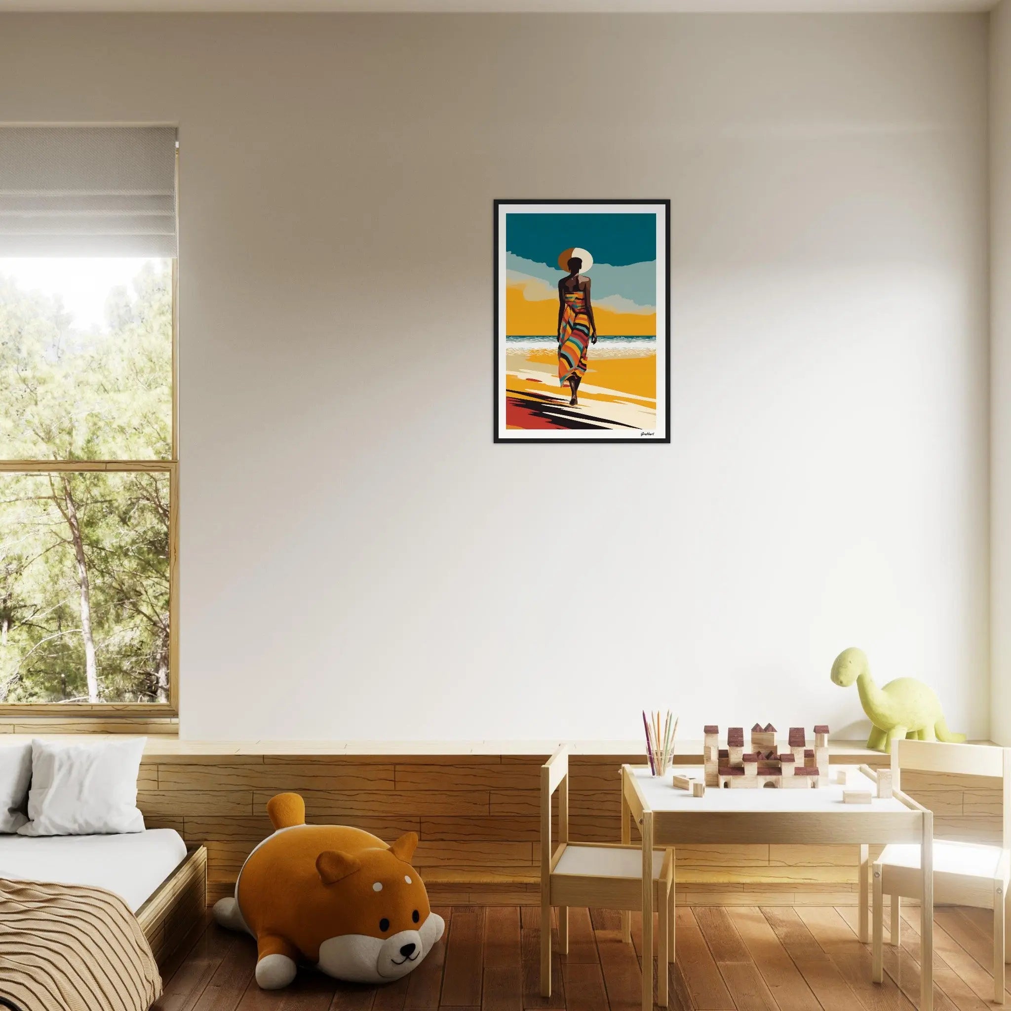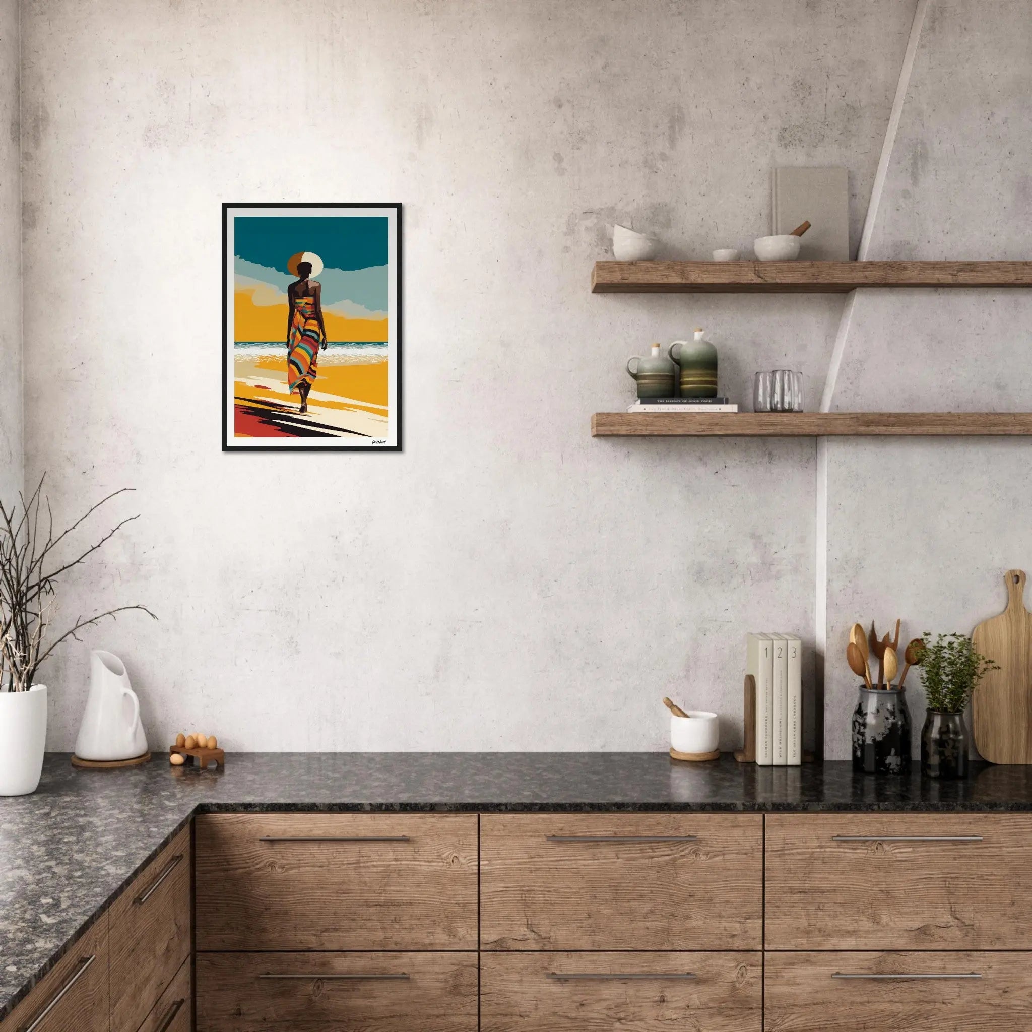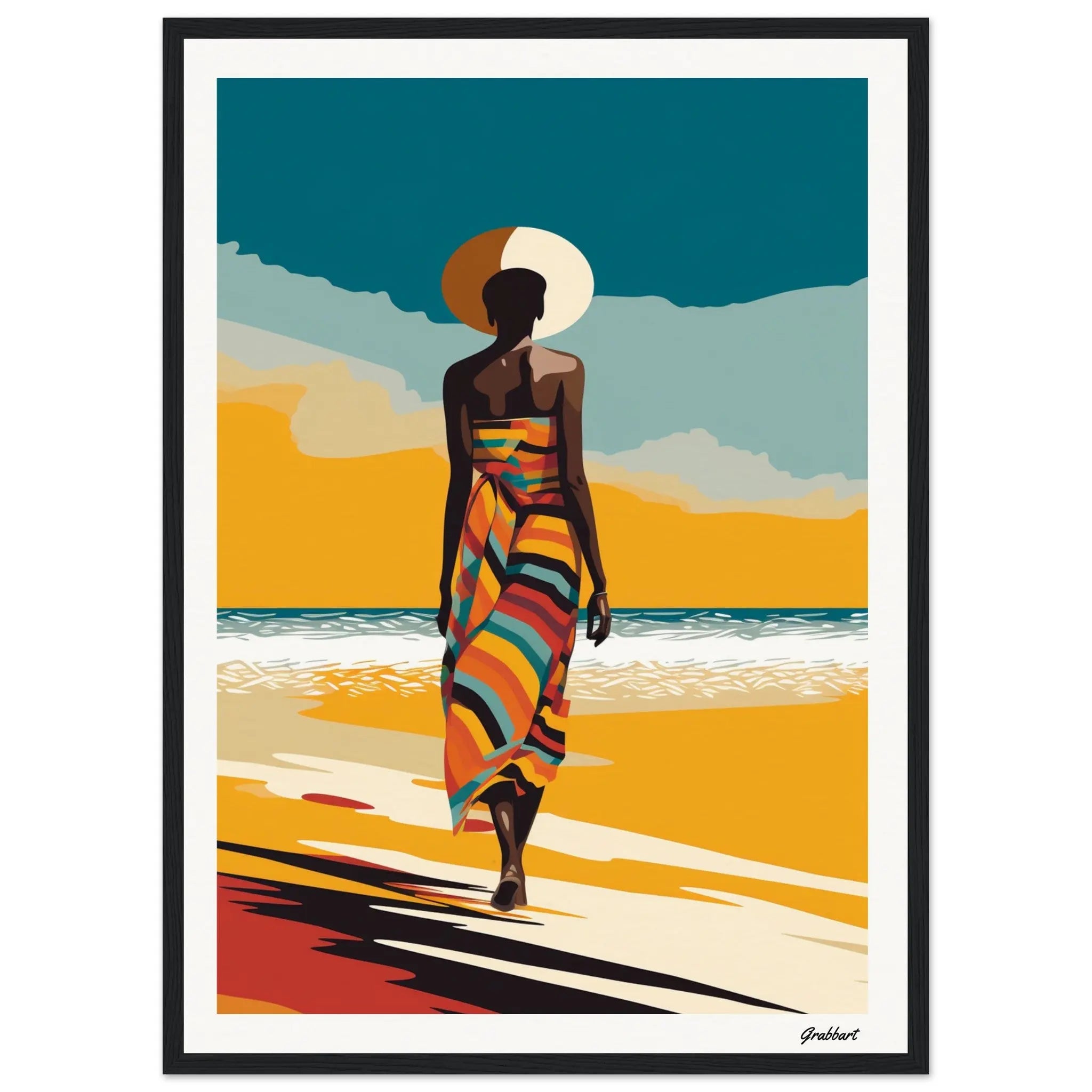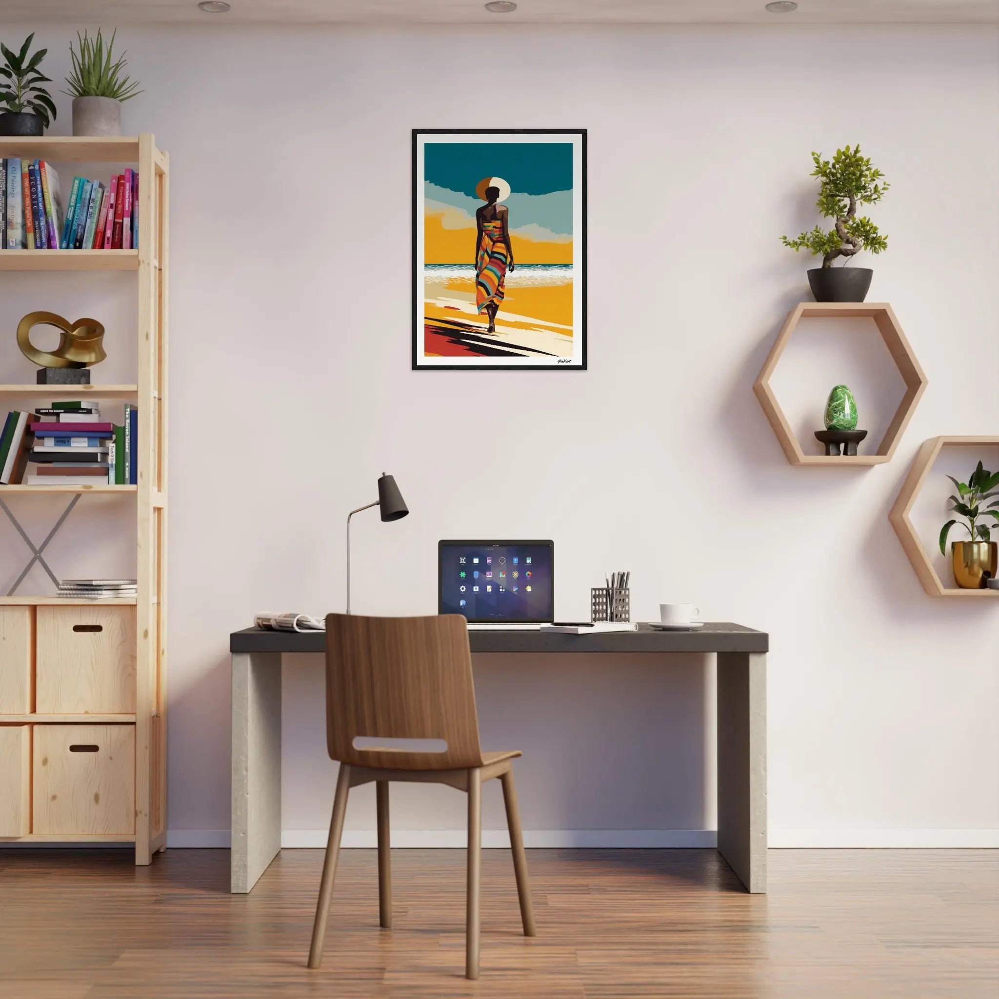 This evocative artwork captures the back view of a woman walking towards the water, her silhouette set against a setting sun. The way her beach hat and the ocean merge into the hues of the horizon speaks to a serene moment of solitude and reflection, inviting the viewer into a world of peaceful retreat.