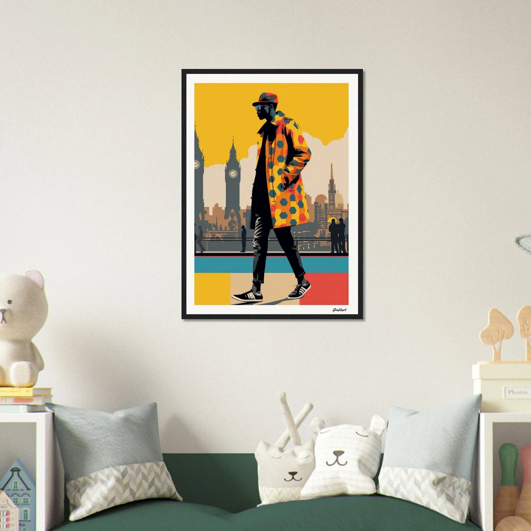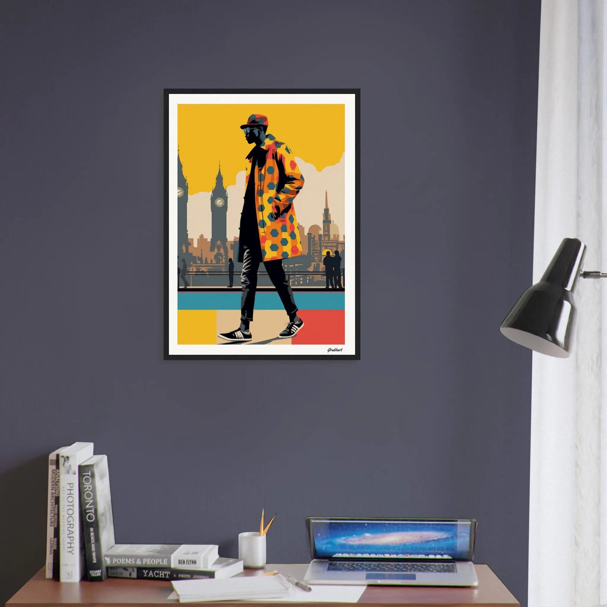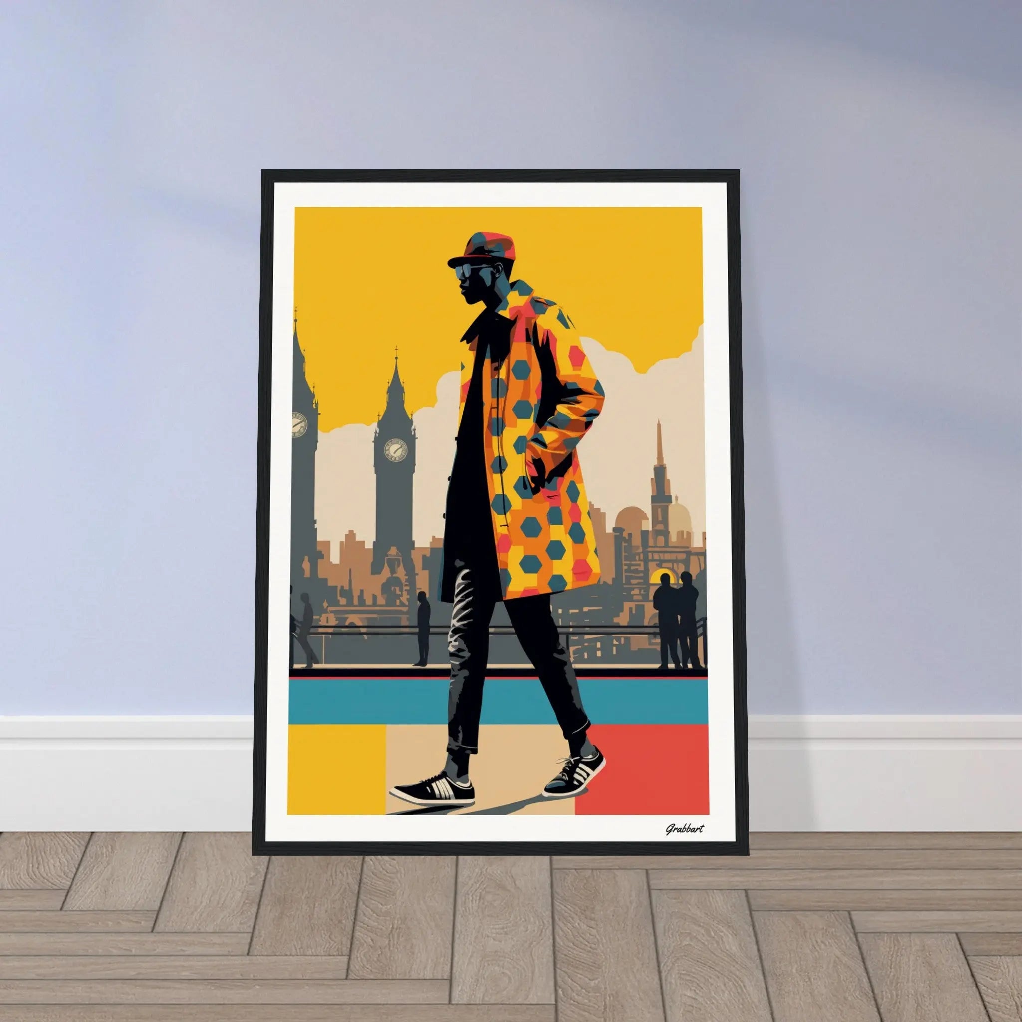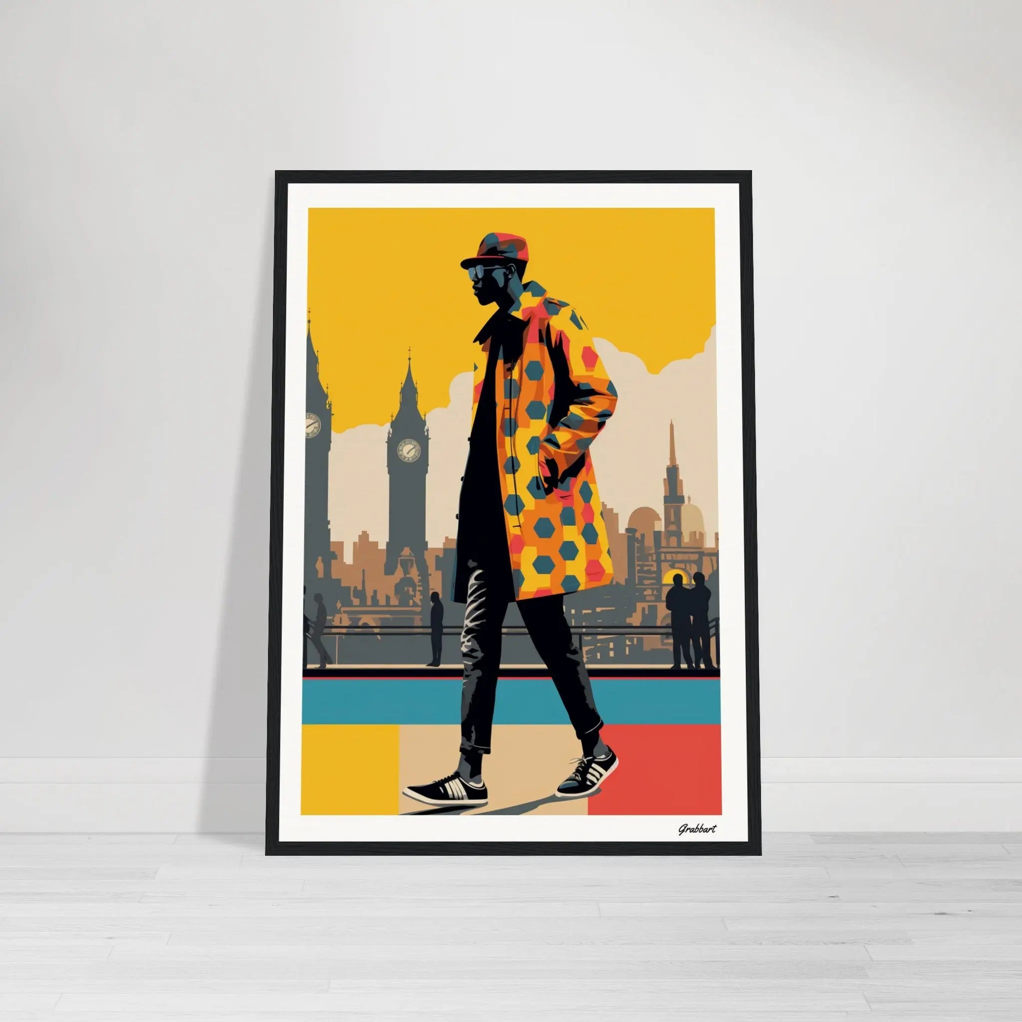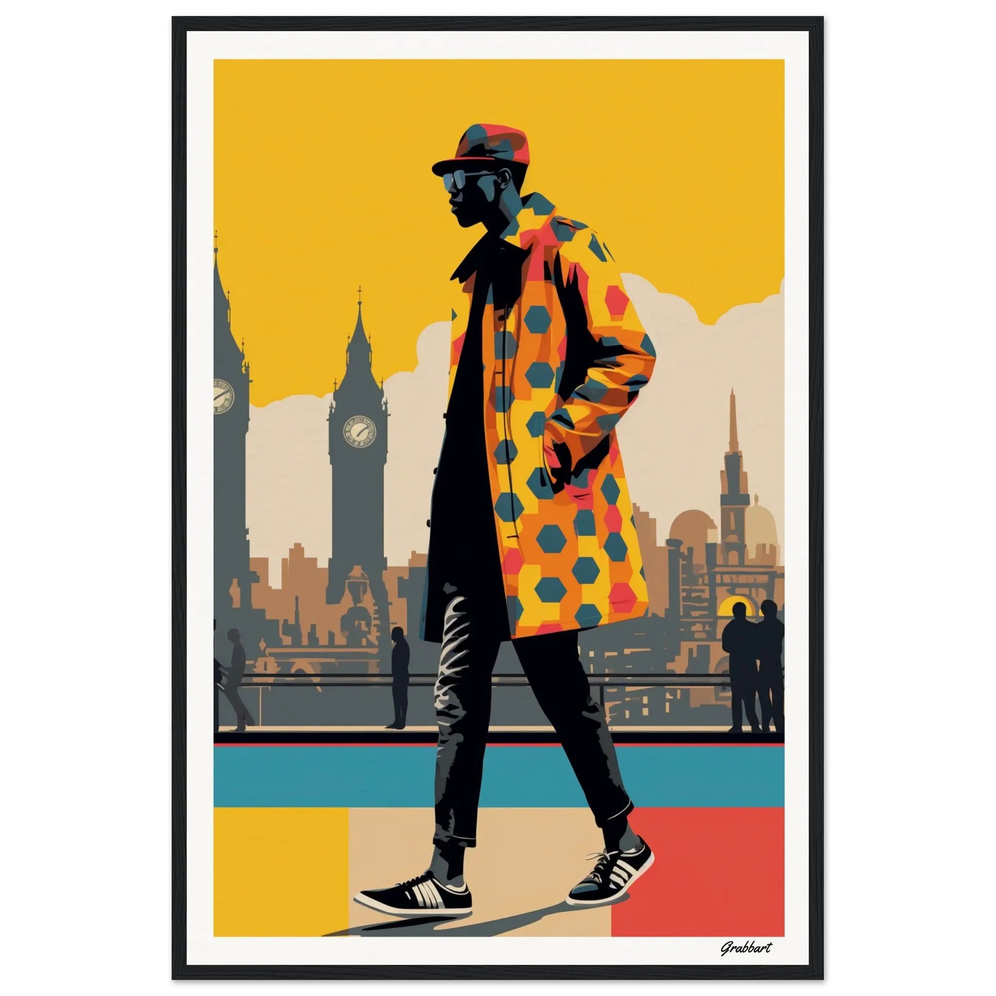 This arresting piece captures an African man navigating the bustling streets of London, each step a dance between his vibrant heritage and the cosmopolitan world around him. The artwork seamlessly melds the vivid colors of his attire with iconic London landmarks, creating a multicultural symphony that is both visually and emotionally impactful.
