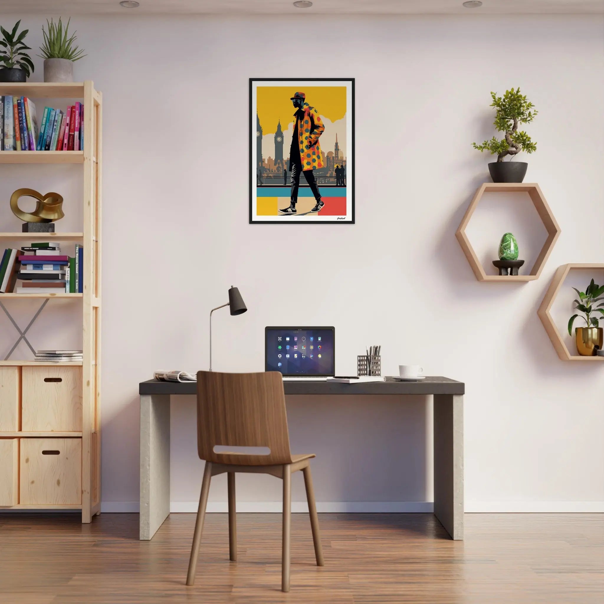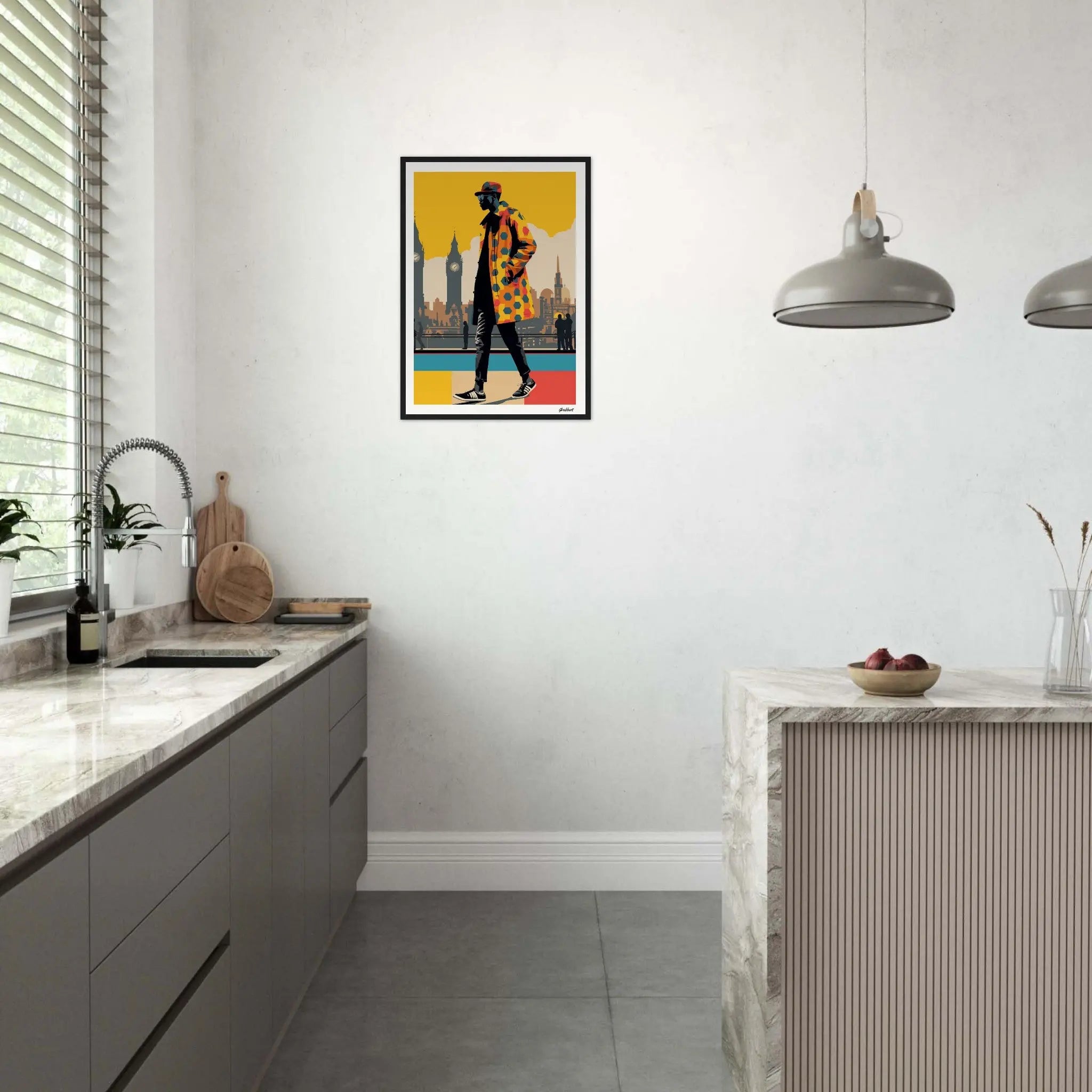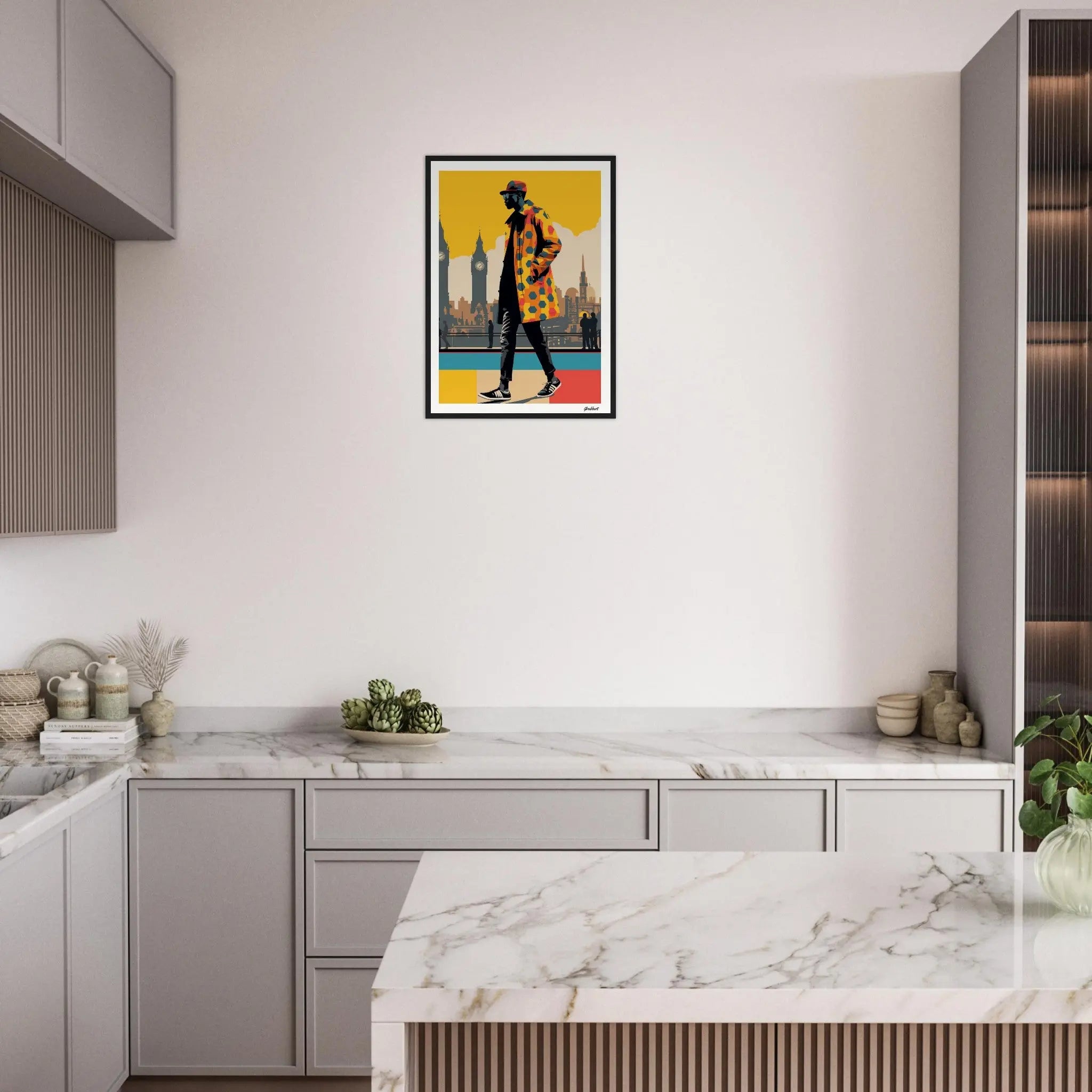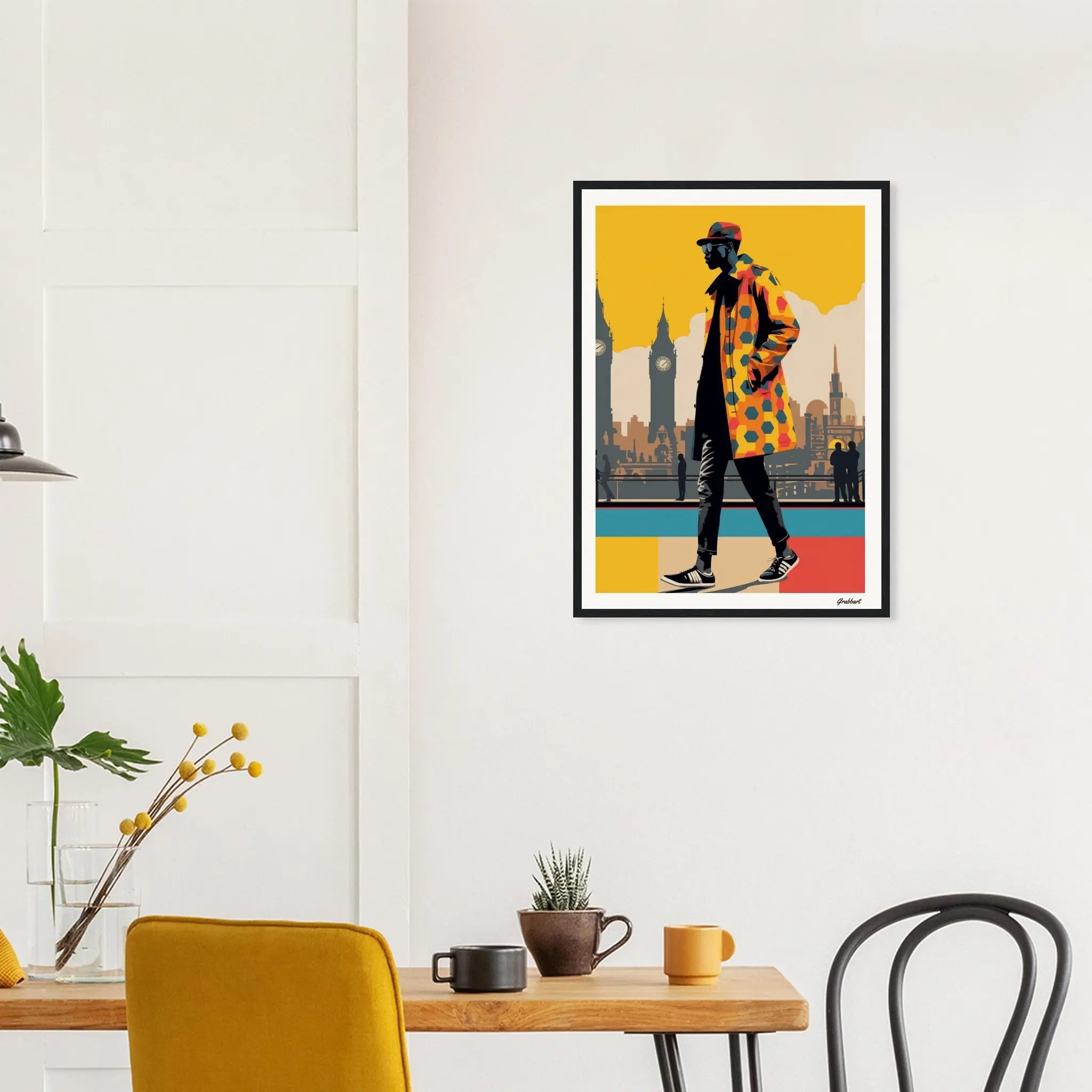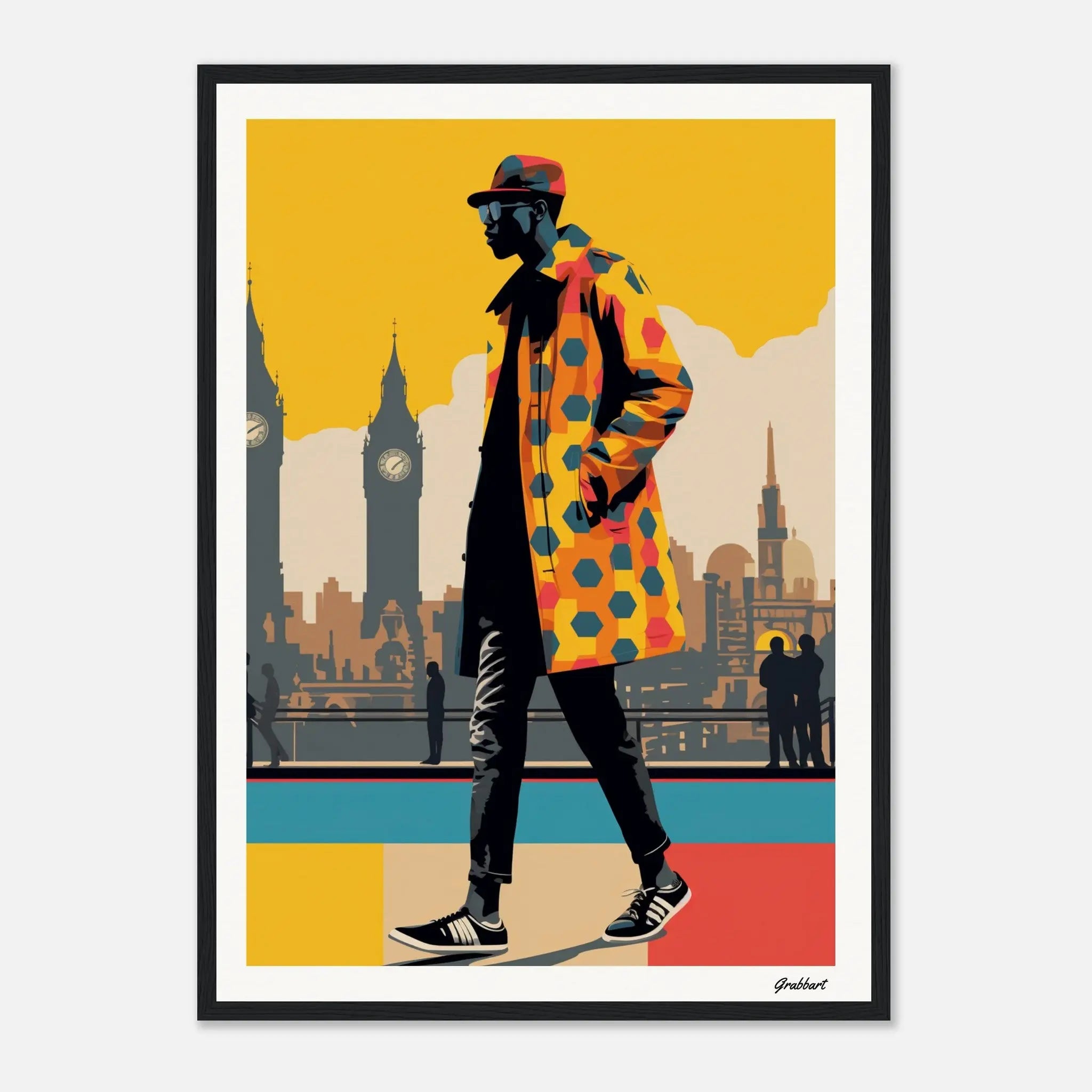 This arresting piece captures an African man navigating the bustling streets of London, each step a dance between his vibrant heritage and the cosmopolitan world around him. The artwork seamlessly melds the vivid colors of his attire with iconic London landmarks, creating a multicultural symphony that is both visually and emotionally impactful.