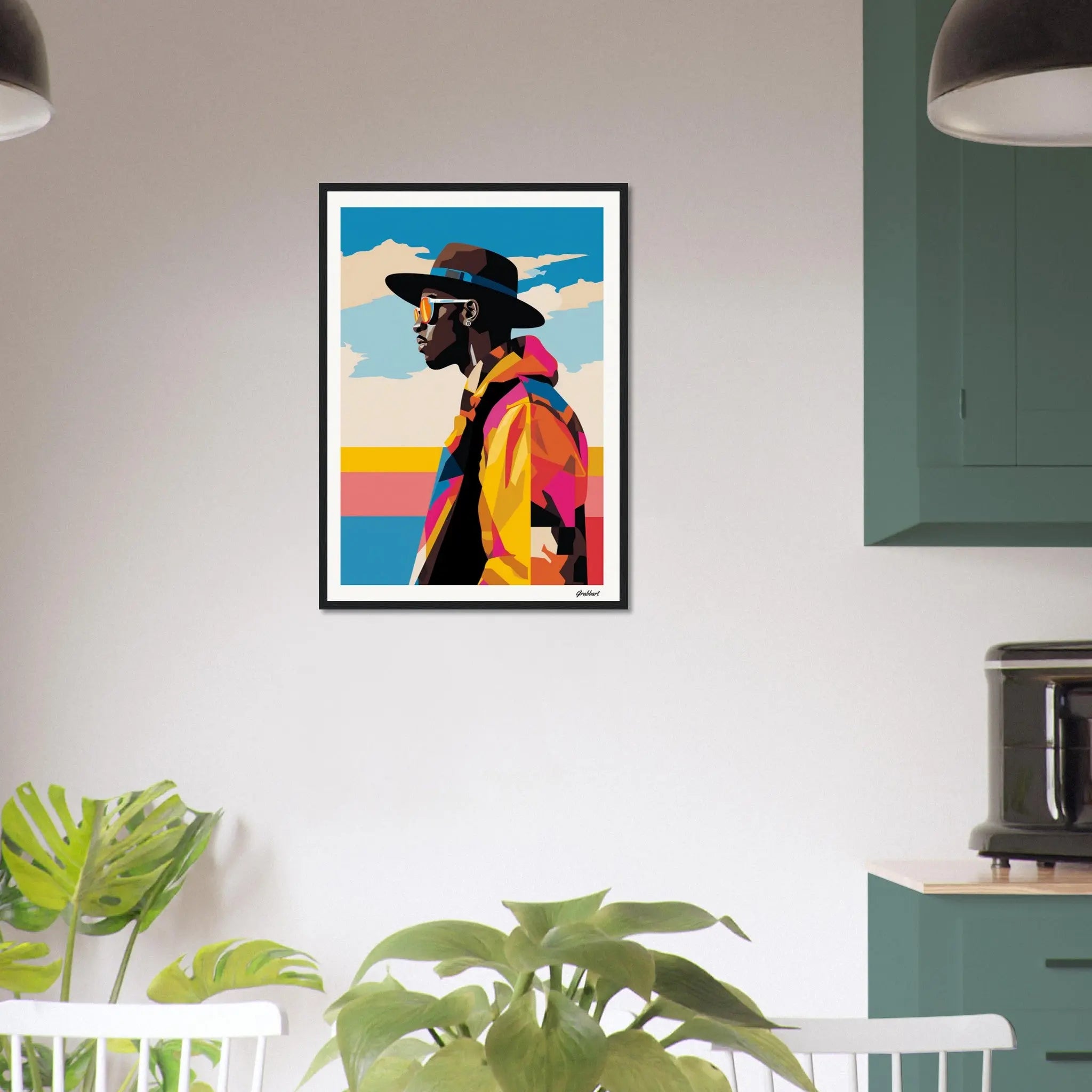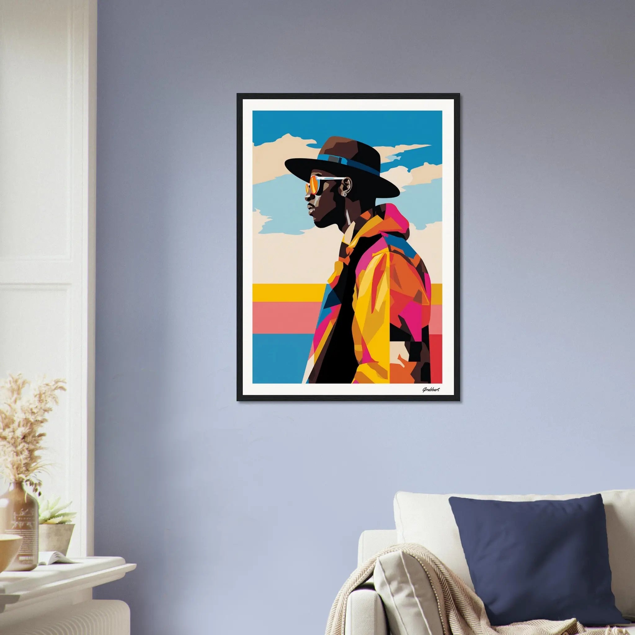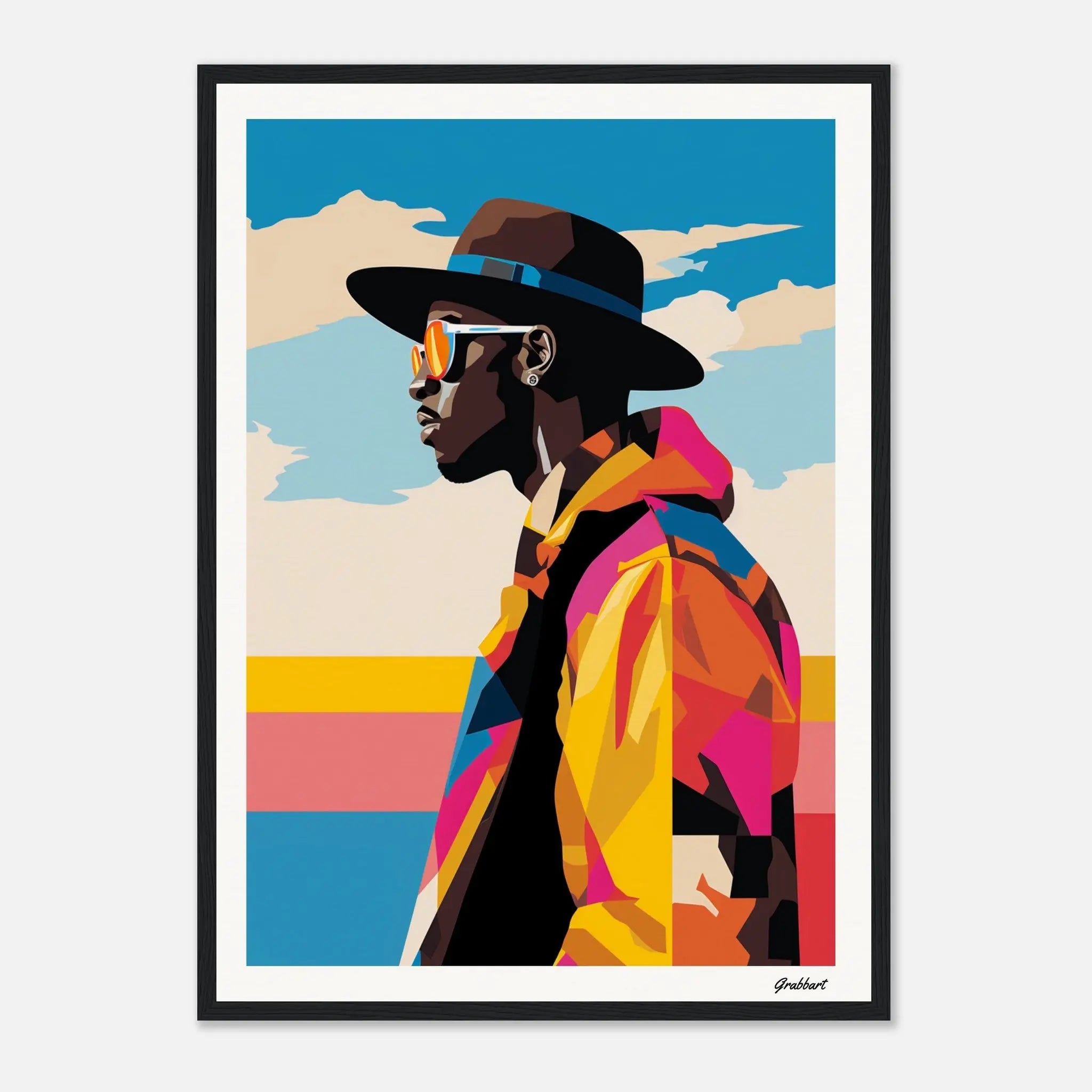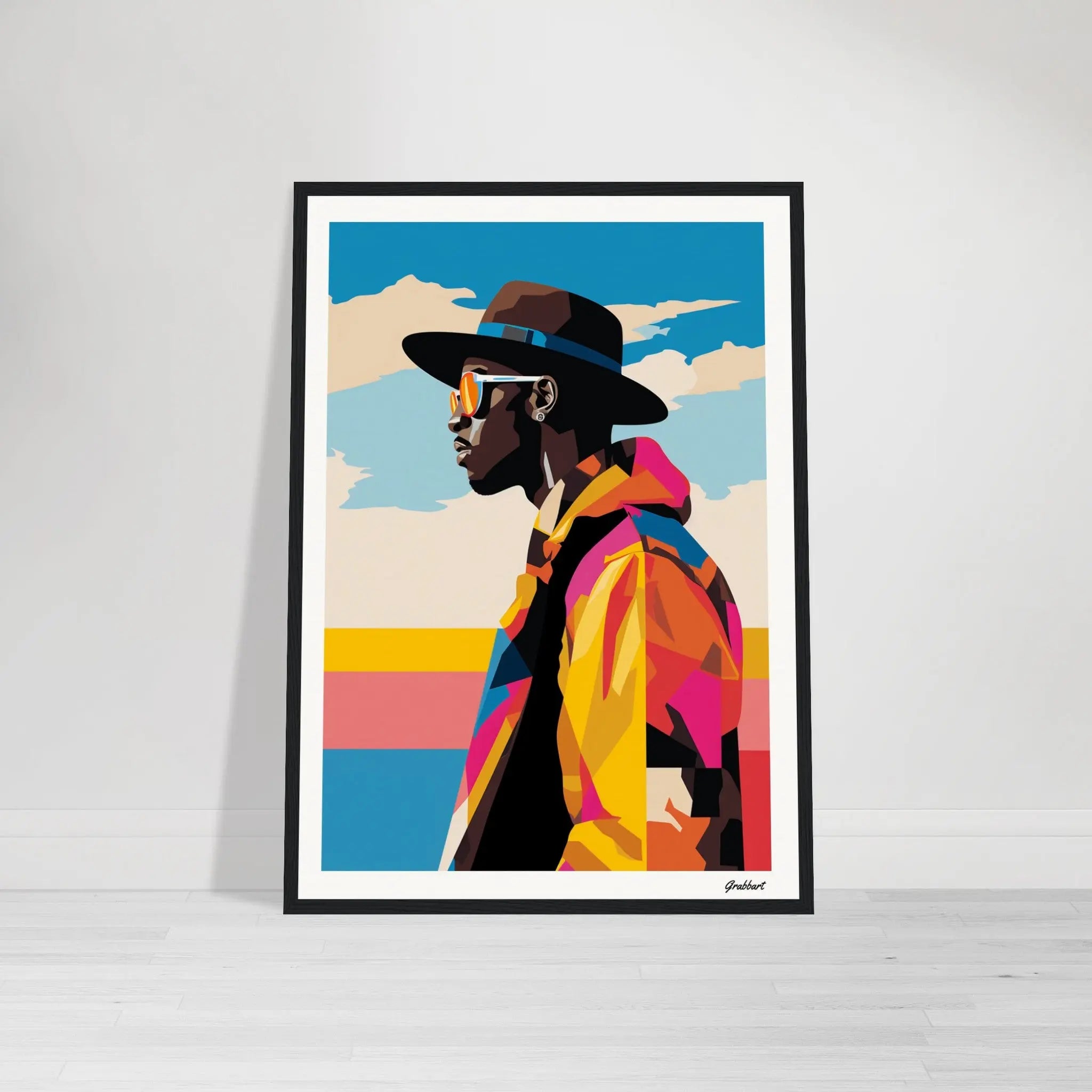 Dive into a kaleidoscope of colors with "Vivid Horizons: Pop Africa Series I," the inaugural piece in our electric 'Pop Africa' collection. A captivating blend of African vibrancy and Pop Art audacity, this stunning print showcases a fashion-forward man captured in a moment of quiet reflection. His orange-tinted sunglasses and vibrant trilby hat provide a striking contrast to his bold coat, which comes to life in hues of orange, pink, and blue. The background dances with blocks of color—yellow, pink, and blue morphing into red as they interact with the subject, creating a riveting visual dialogue that captures the eye and soul alike.