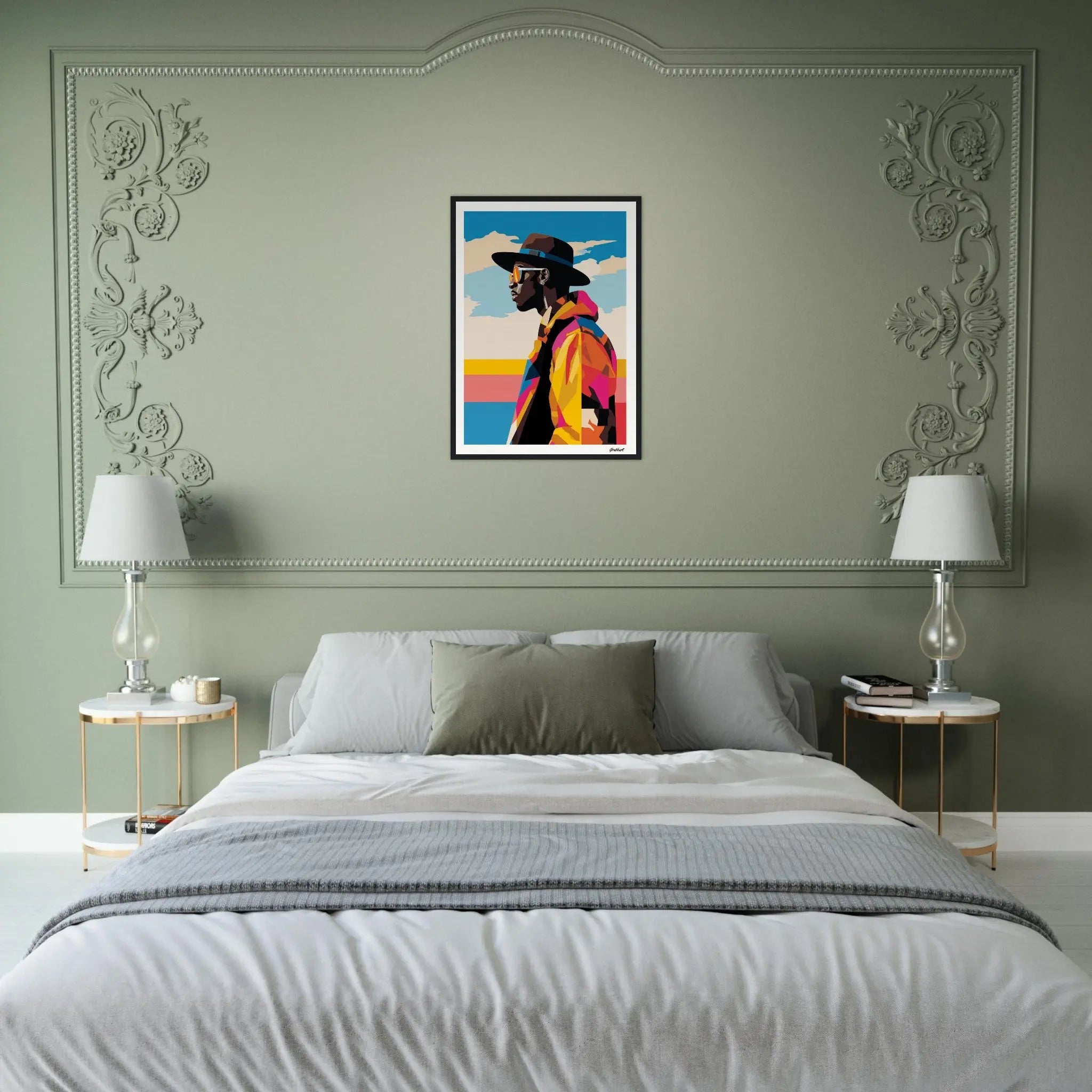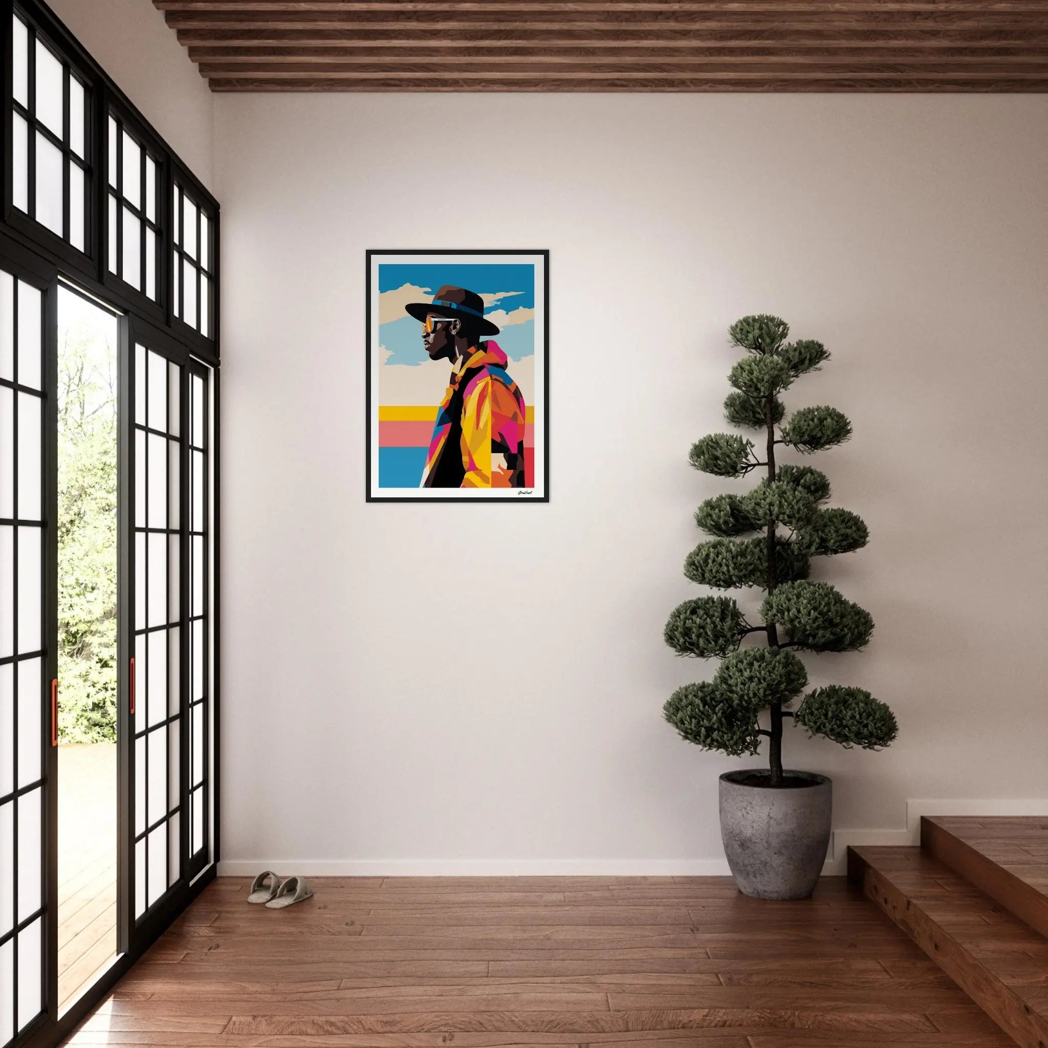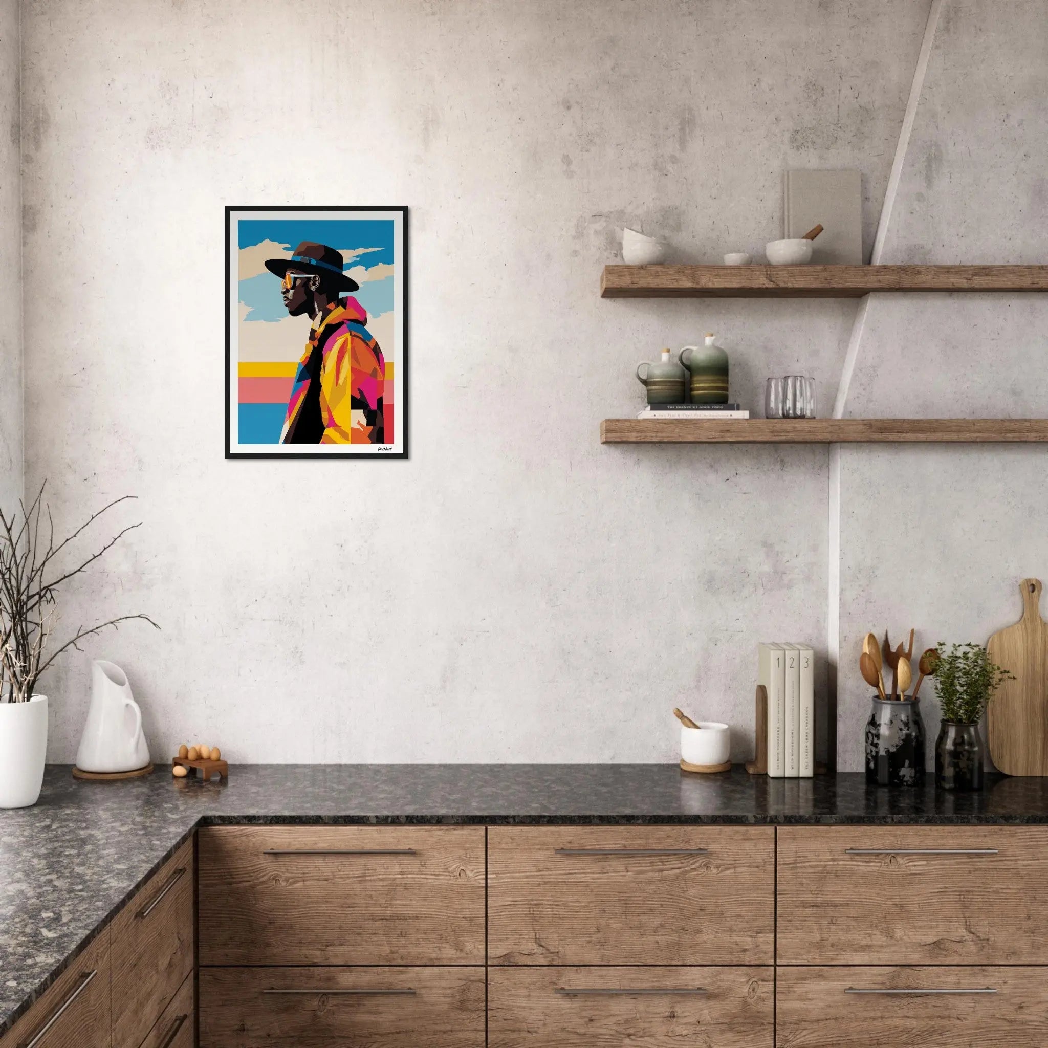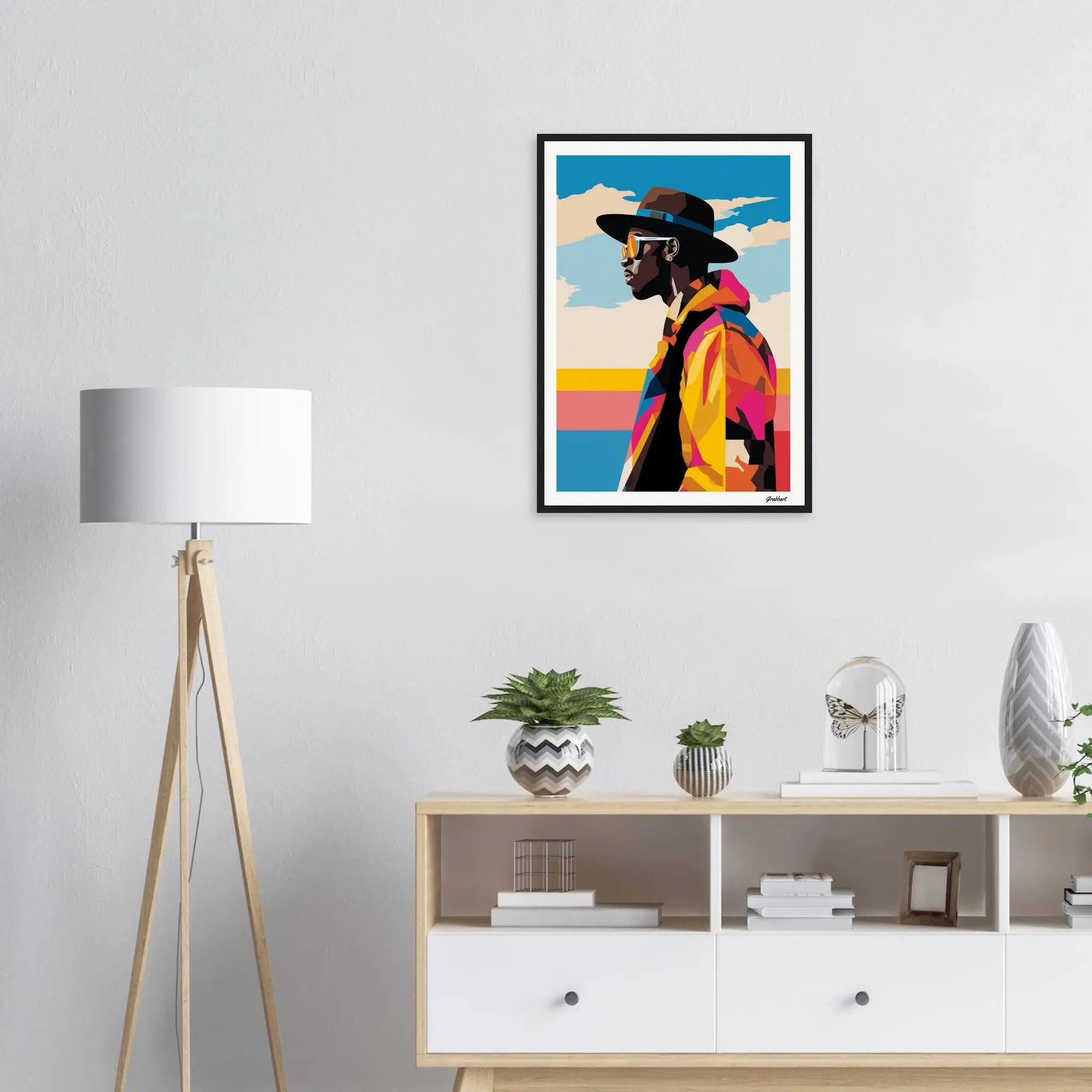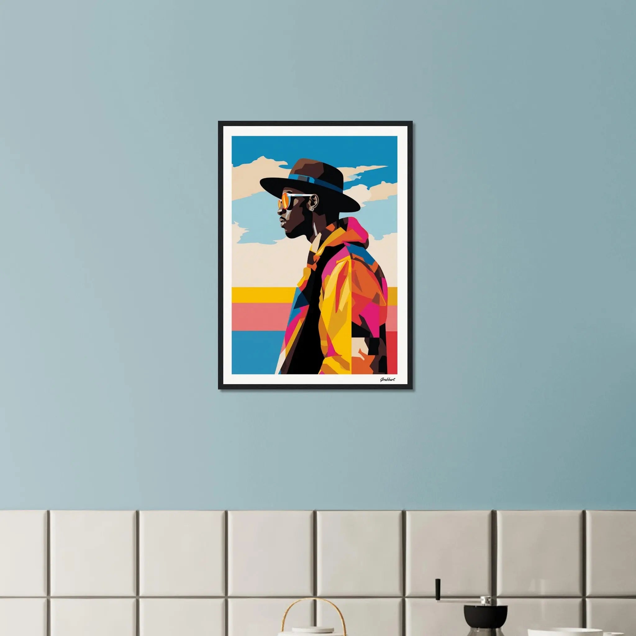 Dive into a kaleidoscope of colors with "Vivid Horizons: Pop Africa Series I," the inaugural piece in our electric 'Pop Africa' collection. A captivating blend of African vibrancy and Pop Art audacity, this stunning print showcases a fashion-forward man captured in a moment of quiet reflection. His orange-tinted sunglasses and vibrant trilby hat provide a striking contrast to his bold coat, which comes to life in hues of orange, pink, and blue. The background dances with blocks of color—yellow, pink, and blue morphing into red as they interact with the subject, creating a riveting visual dialogue that captures the eye and soul alike.