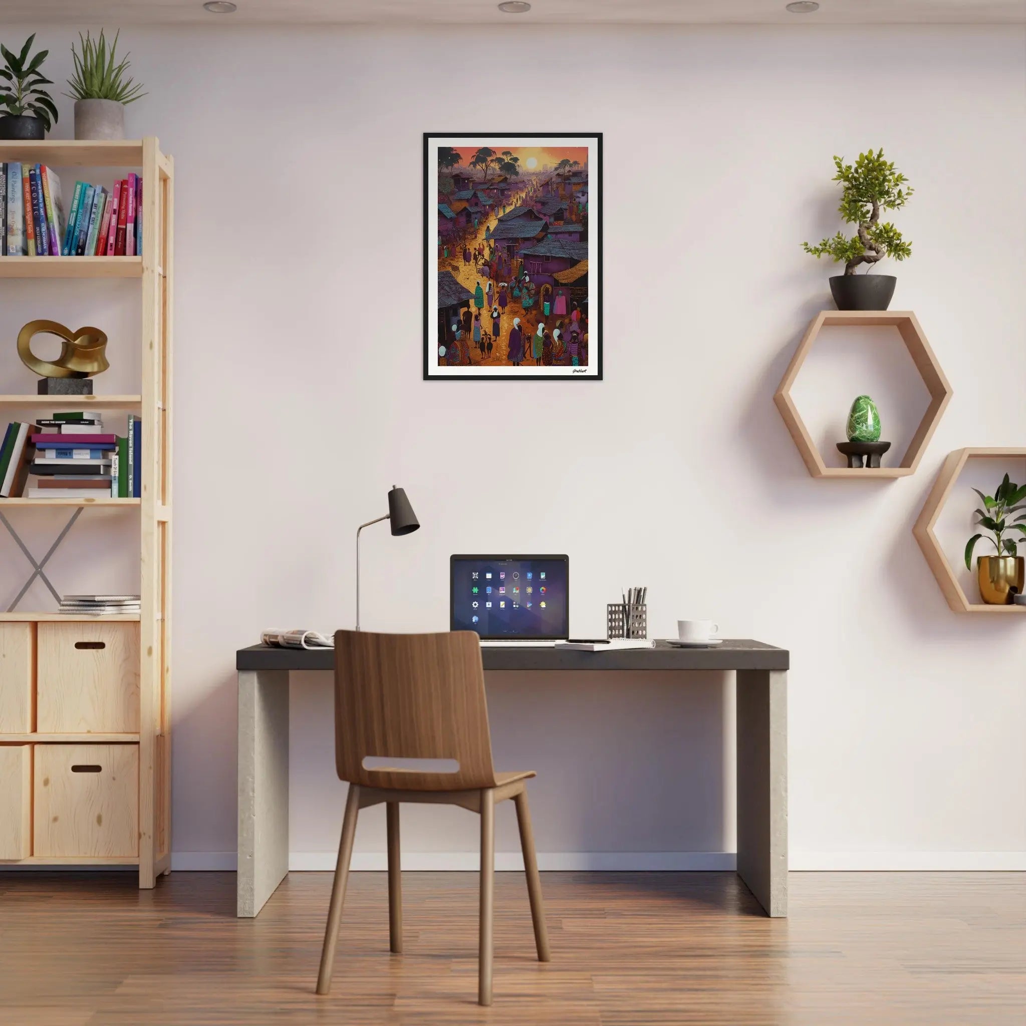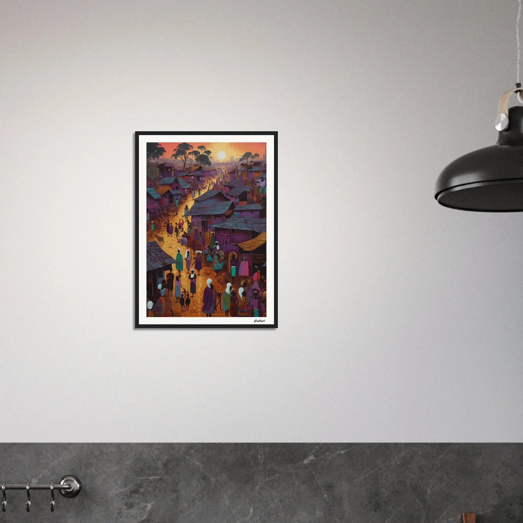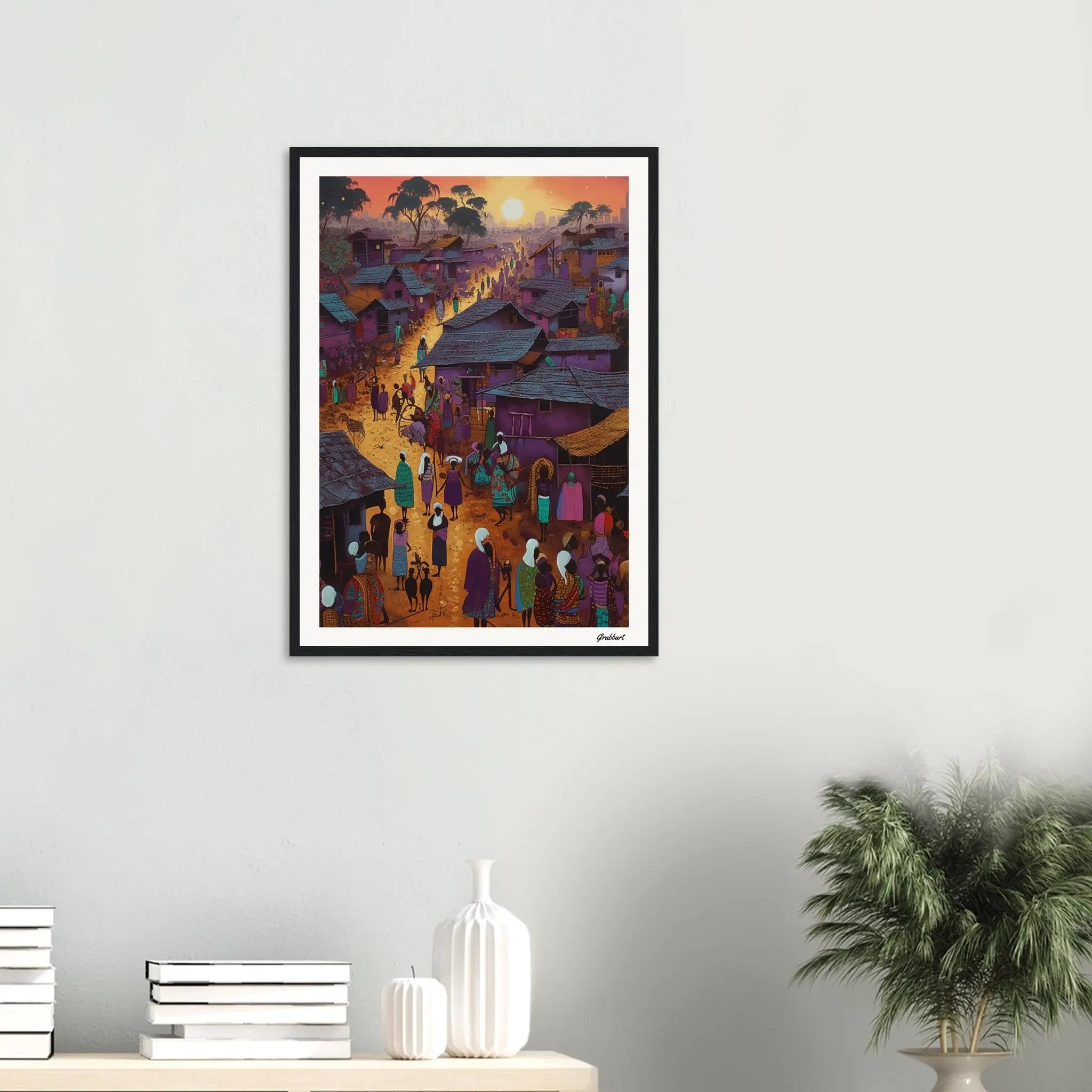 Immerse yourself in the rich tapestry of "Golden Horizons: The Dance of Twilight and Tradition," a luminescent Impressionist masterpiece that elegantly blends tradition with modernity. The canvas is alive with the golden hues of an African village at sunset, where purple houses line the streets and villagers don colorful robes that appear to dance in the dying light.